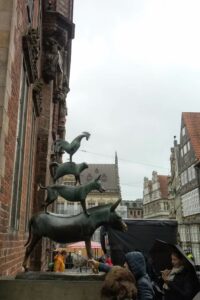 Om alvast te acclimatiseren, vertrokken we op zondag; in Utrecht was de Singelloop in volle gang en aangekomen in Bremen zagen we ’s middags de afbouw van de Bremer Marathon die die dag in de stad was gehouden. Hanzestad Bremen is ietsje groter dan Utrecht en heeft ook een oude binnenstad. Ook daar is fietsen populair. Natuurlijk moesten we eerst op zoek naar het beeld van de beroemde Bremer Stadsmuzikanten.