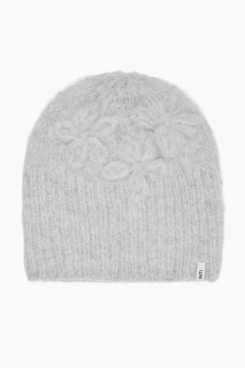 • Handgebreide muts met bloemen lichtgrijs