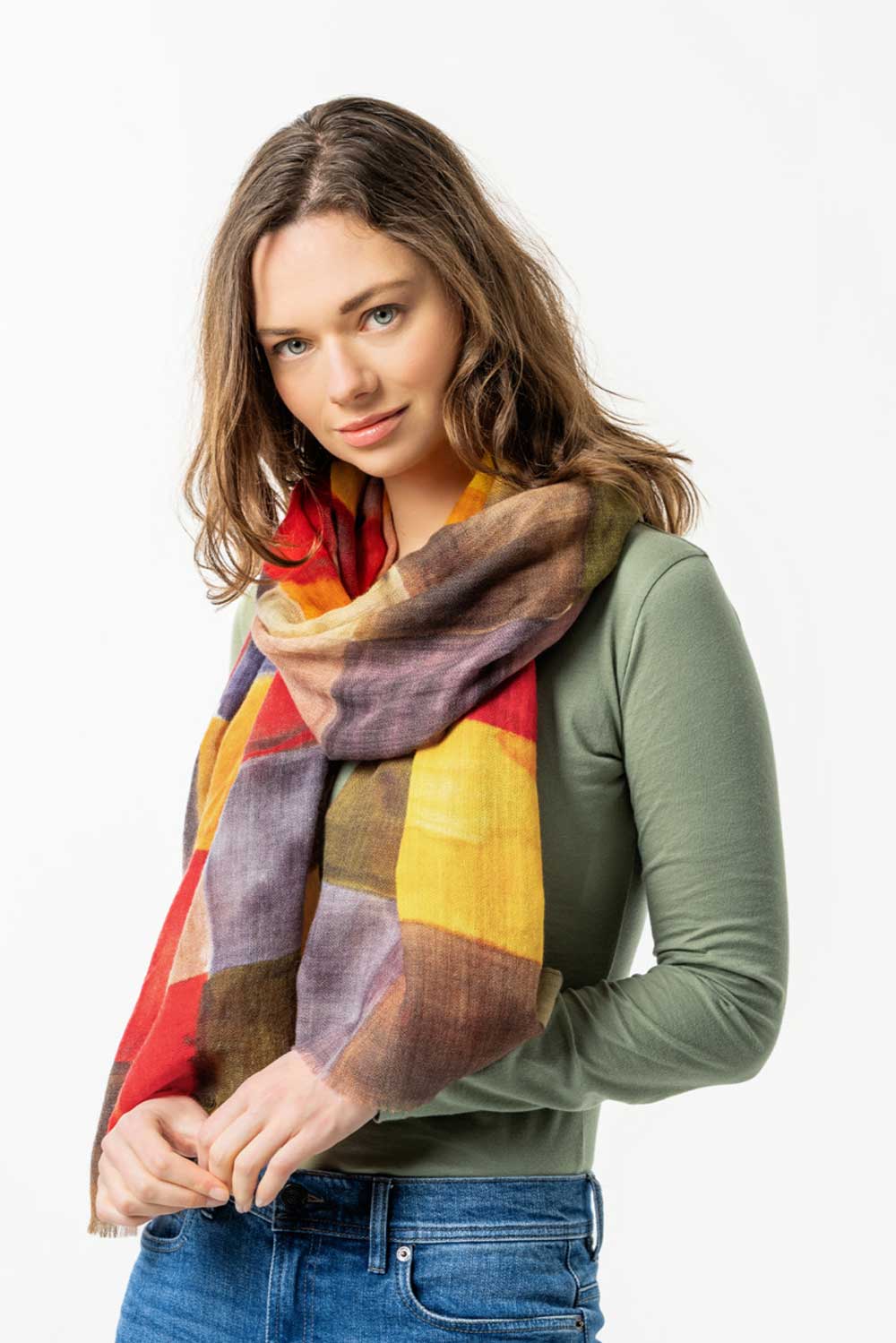 Geweven dunne wollen sjaal van 100% wol. Met zoveel kleuren dat het makkelijk te combineren is. lengte 200 cm, breedte 80 cm.