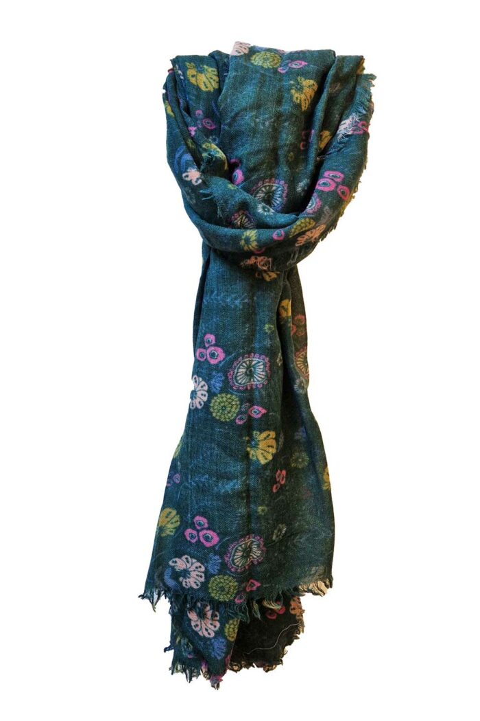 Dunne lange sjaal met botanische print van 100% zachte biologische merinowol. In de print zit donkergroen, roze, oker, magenta en lila. Rondom de sjaal zitten kleine franjes.
