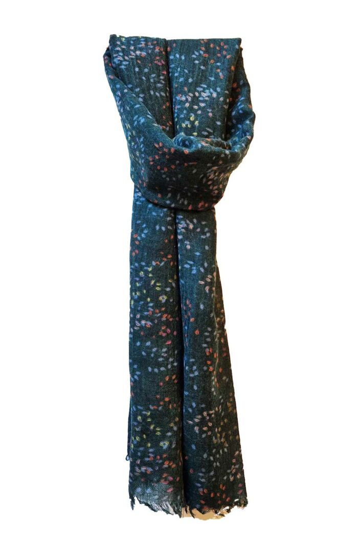 Dunne, zachte wollen sjaal met botanische print. In de print zit donkergroen, oranje, lila, roze, lichtgeel en groen. Rondom de sjaal zitten kleine franjes.