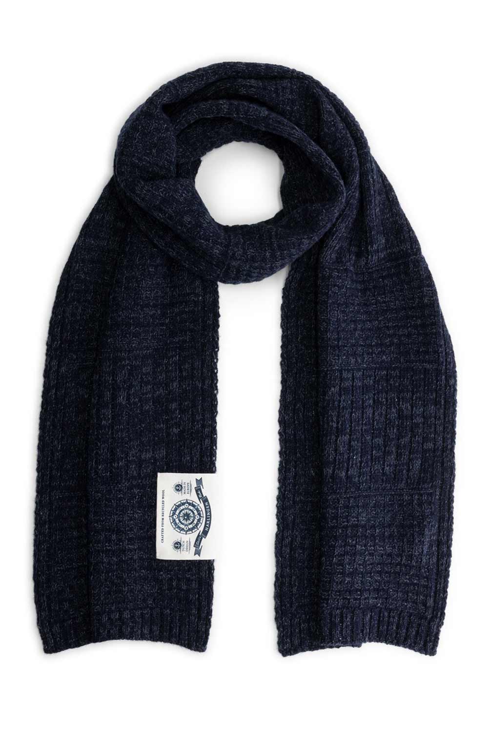 Donkerblauwe sjaal van een gerecyclede materialenmix: 61% gerecyclede wol, 21% polyamide, 8% gerecycled katoen, 5% gerecycled polyamide, 5% overige gerecyclede materialen. Maatindicatie: 180 x 26 cm.