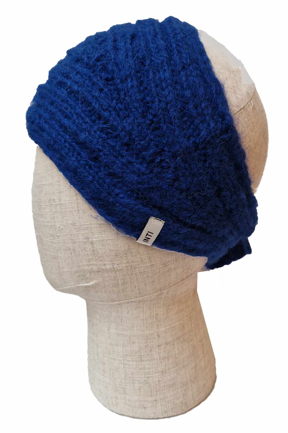 Wollen hoofdband van baby alpaca wol in (kobalt) blauw. De band is breed van voren en loopt smal toe en sluit met een knoop en knoopsgat. De bandana is gebreid door Talia Chapi.