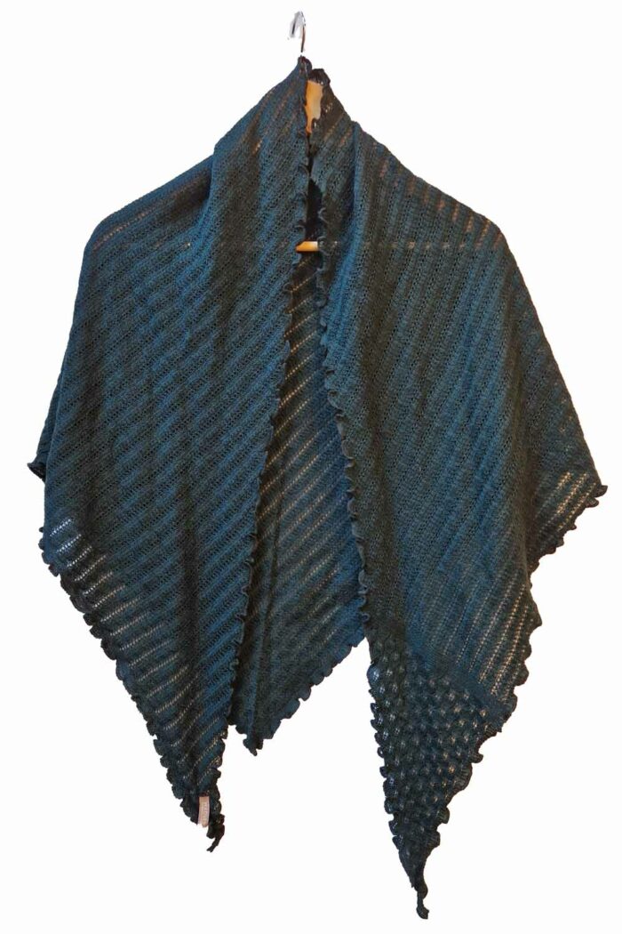 De ajour sjaal is driehoekig en de langste kant is 250 cm. De shawl is van 100% zachte merinowol.