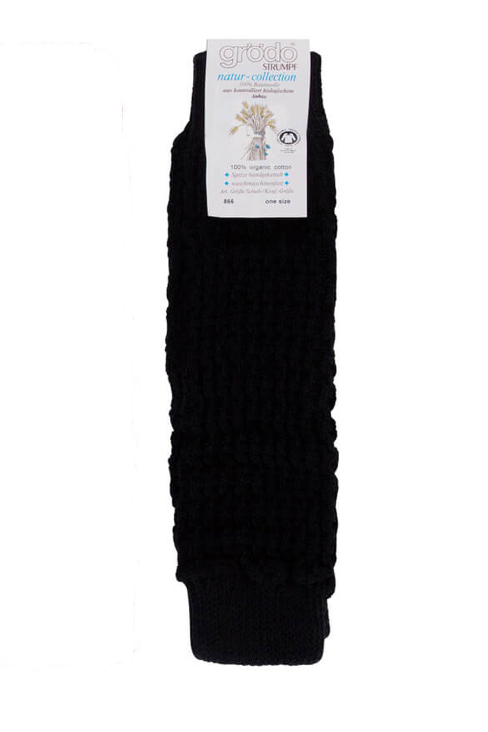 Beenwarmers van 100% biologische wol met een subtiel ingebreid patroon. Lengte: 35 cm.