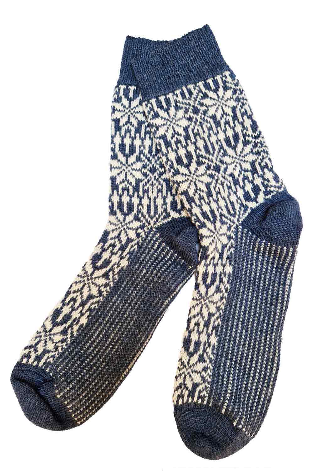 Nooit meer koude voeten met deze fraaie, dikke wollen sokken met Noorse ster-print! Van 100% biologische wol. Goed te dragen in je wandelschoen, maar ook als lekkere huissok voor in de slipper of slof.