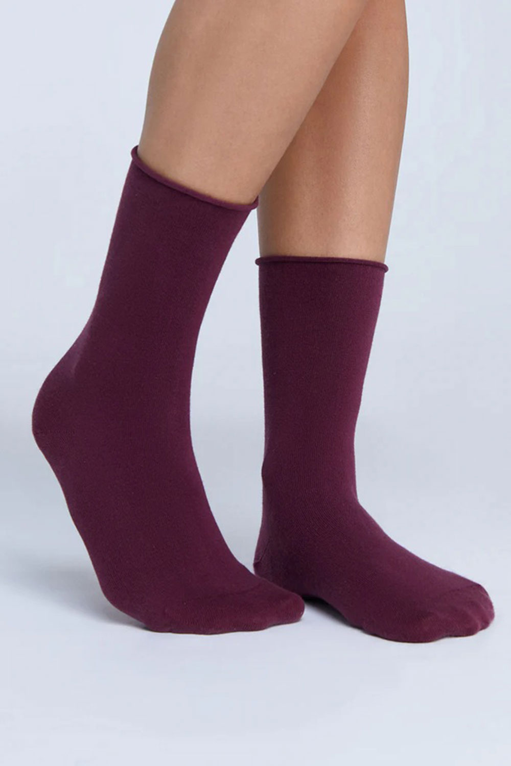 Bordeaux sokken van 98% biokatoen en 2% elastan. Ze hebben geen boord dus knellen niet. Aan de bovenkant kruillen ze een beetje om.