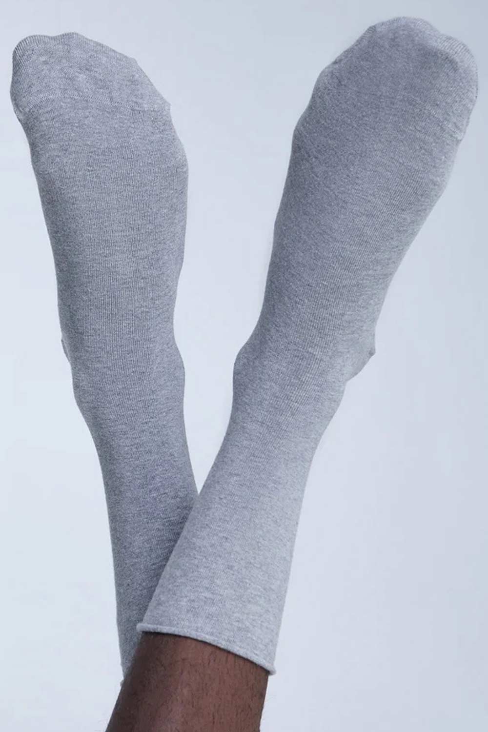 Blauwe sokken van 98% biokatoen en 2% elastan. Ze hebben geen boord dus knellen niet. Aan de bovenkant kruillen ze een beetje om.
