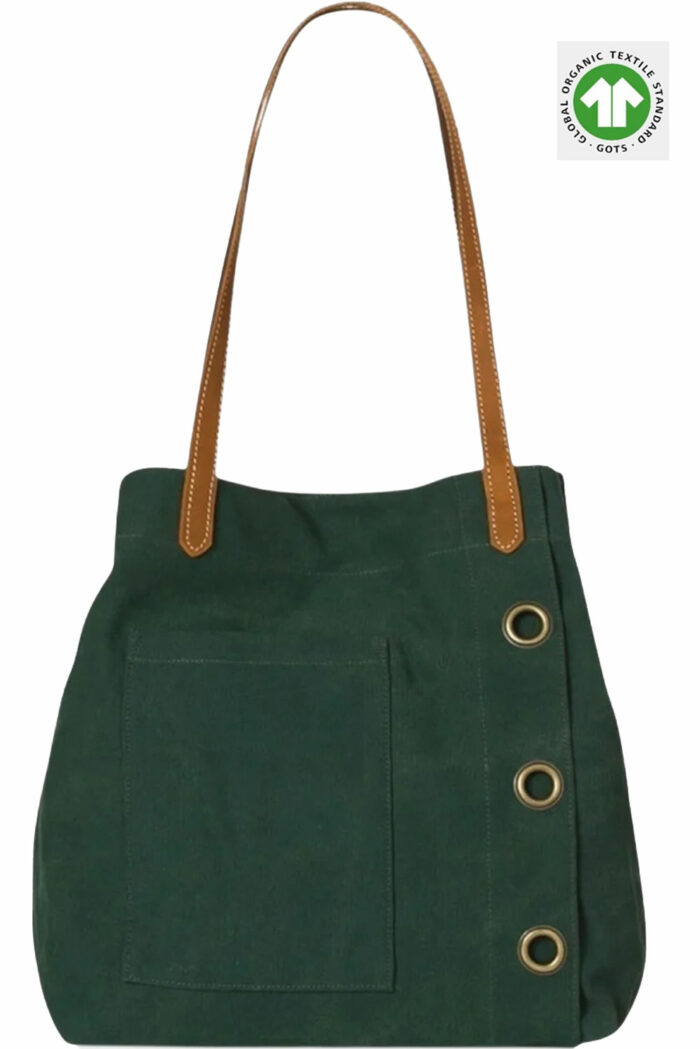 Canvas schoudertas, in de kleur stonewashed groen. De tas heeft verschillende binnenvakken en een extra vak aan de buitenkant. De 2 stevige schouderbanden zijn van leer en de tas sluit met een magentische button. In de tas zit ook een riempje met een karabijnhaak hiermee maak je de tas groter of kleiner. Fairtrade gemaakt in Thailand. Afmetingen: (hxlxb in cm) 35 x 31 x 15