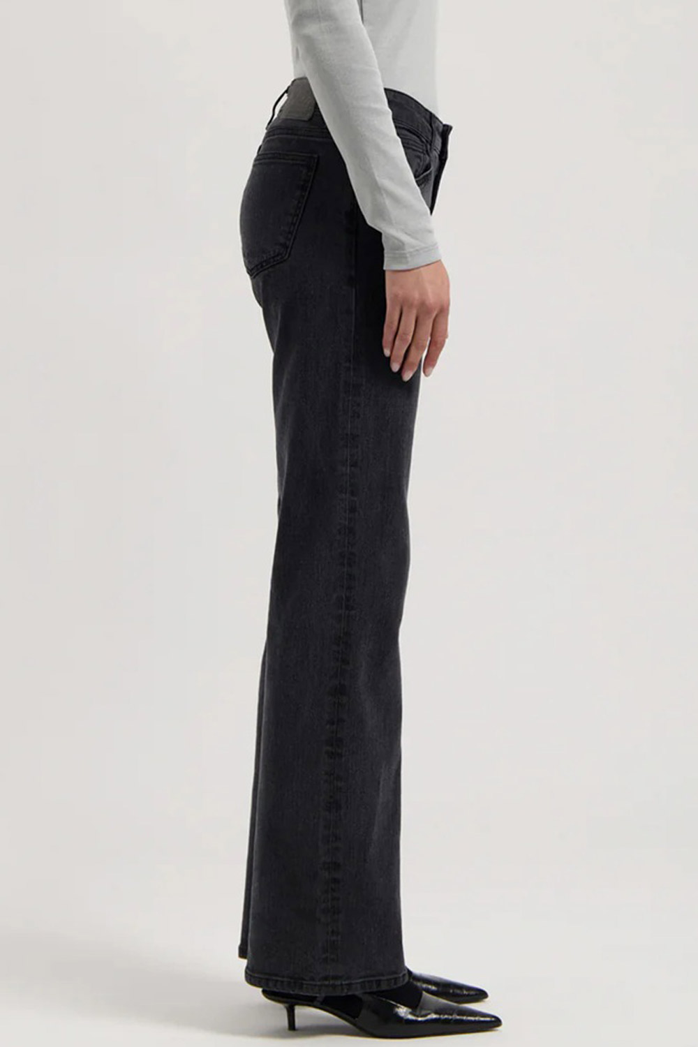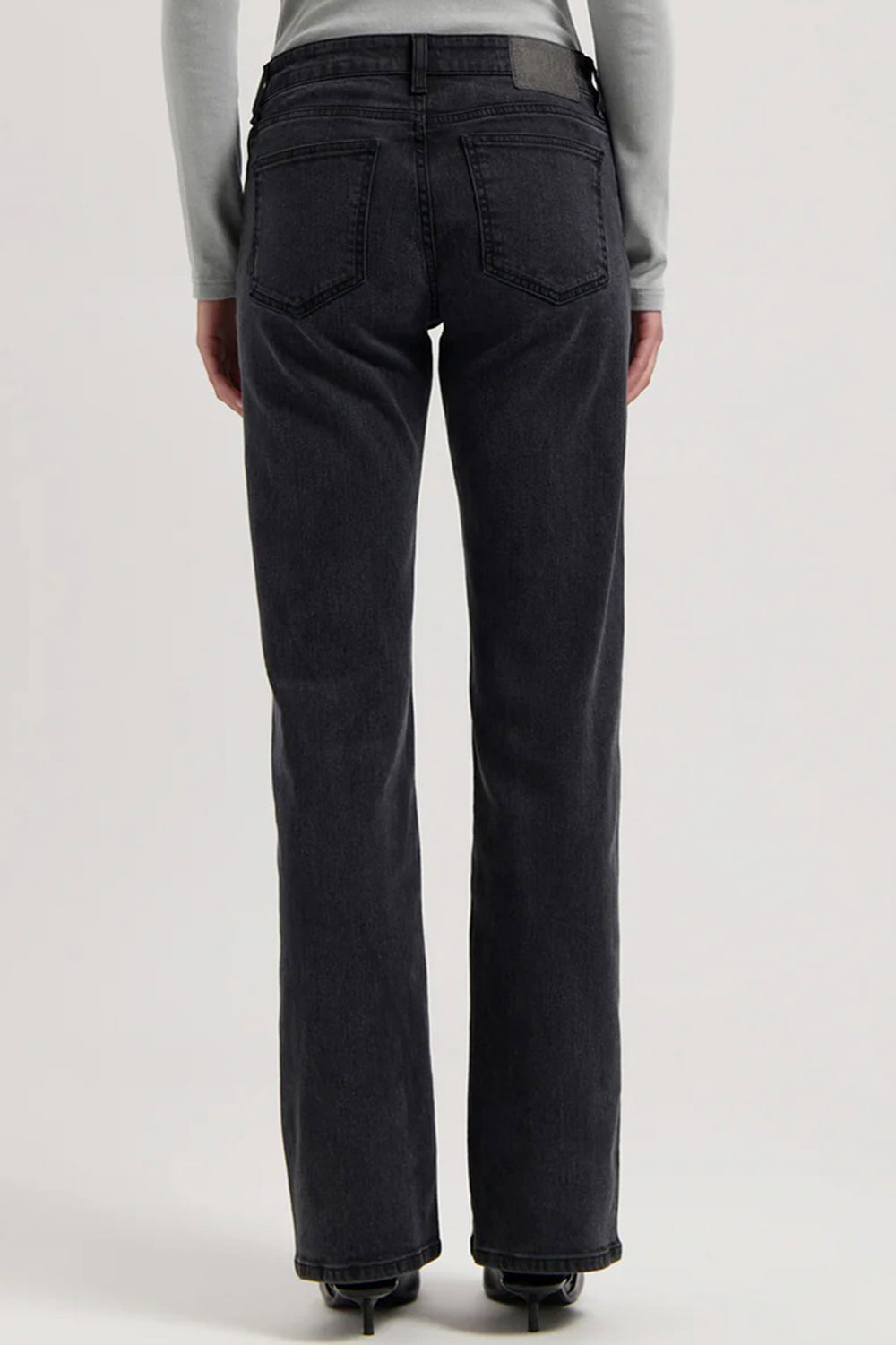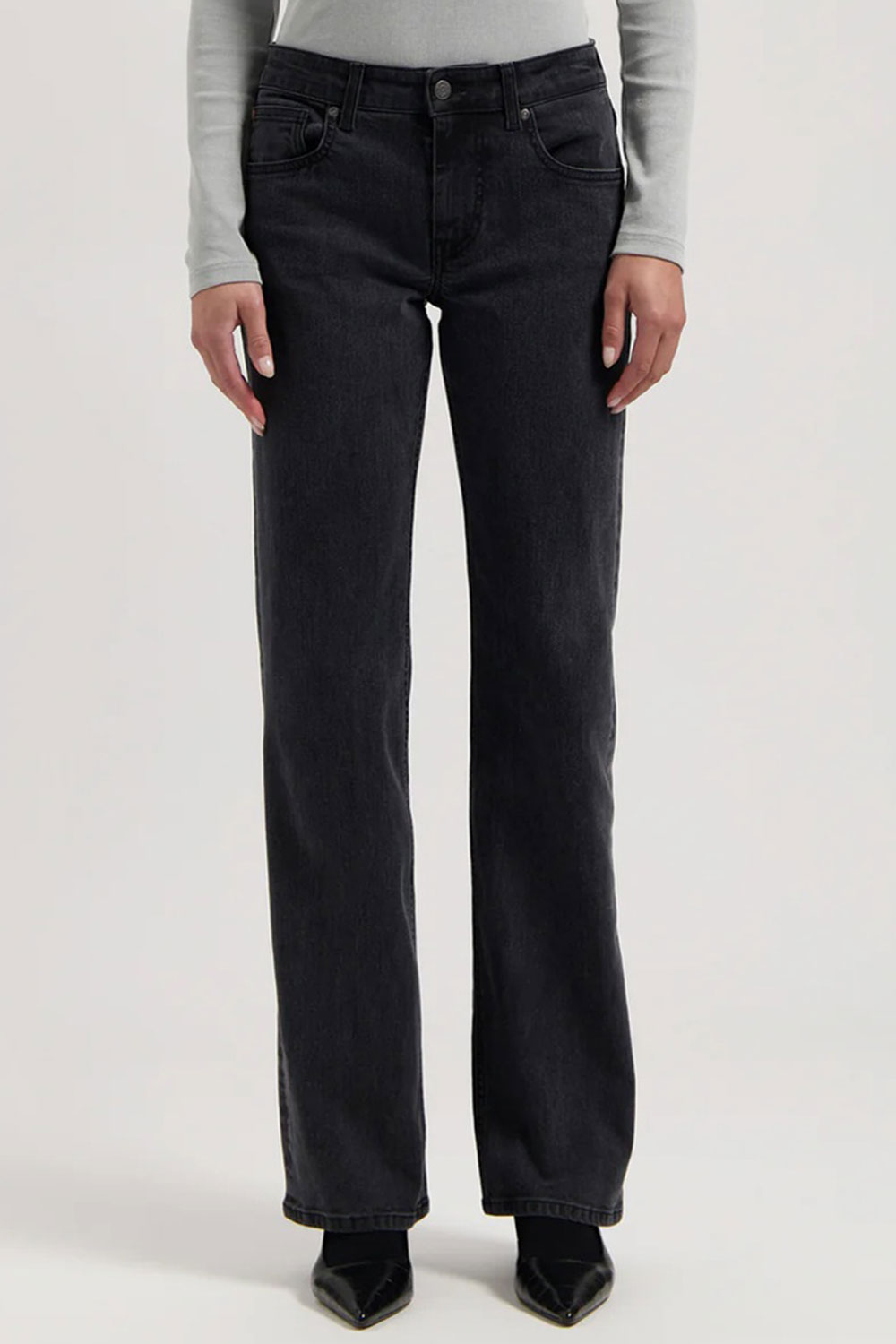 Spijkerbroek met hoge taille en redelijk wijde rechte pijpen. Materiaal: 47% gerecyceld katoen, 27% biokatoen, 25% lyocell, 1% elastan. Maatindicatie: 30 taille = 84 cm. Binnenbeenlengte: 32 = 80 cm.