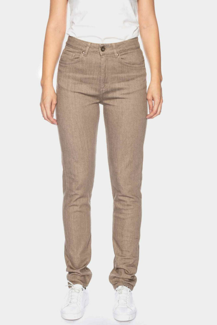 Wat hoger in de taille zittende 5 pocket damesjeans met smallere, taps toelopende pijpen in mooie kleur lichtbruin. De lichtbruine of beige broek combineert goed met allerlei tinten blauw en (bordeaux) rood.