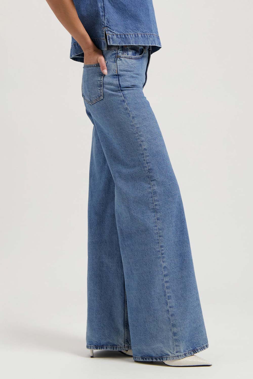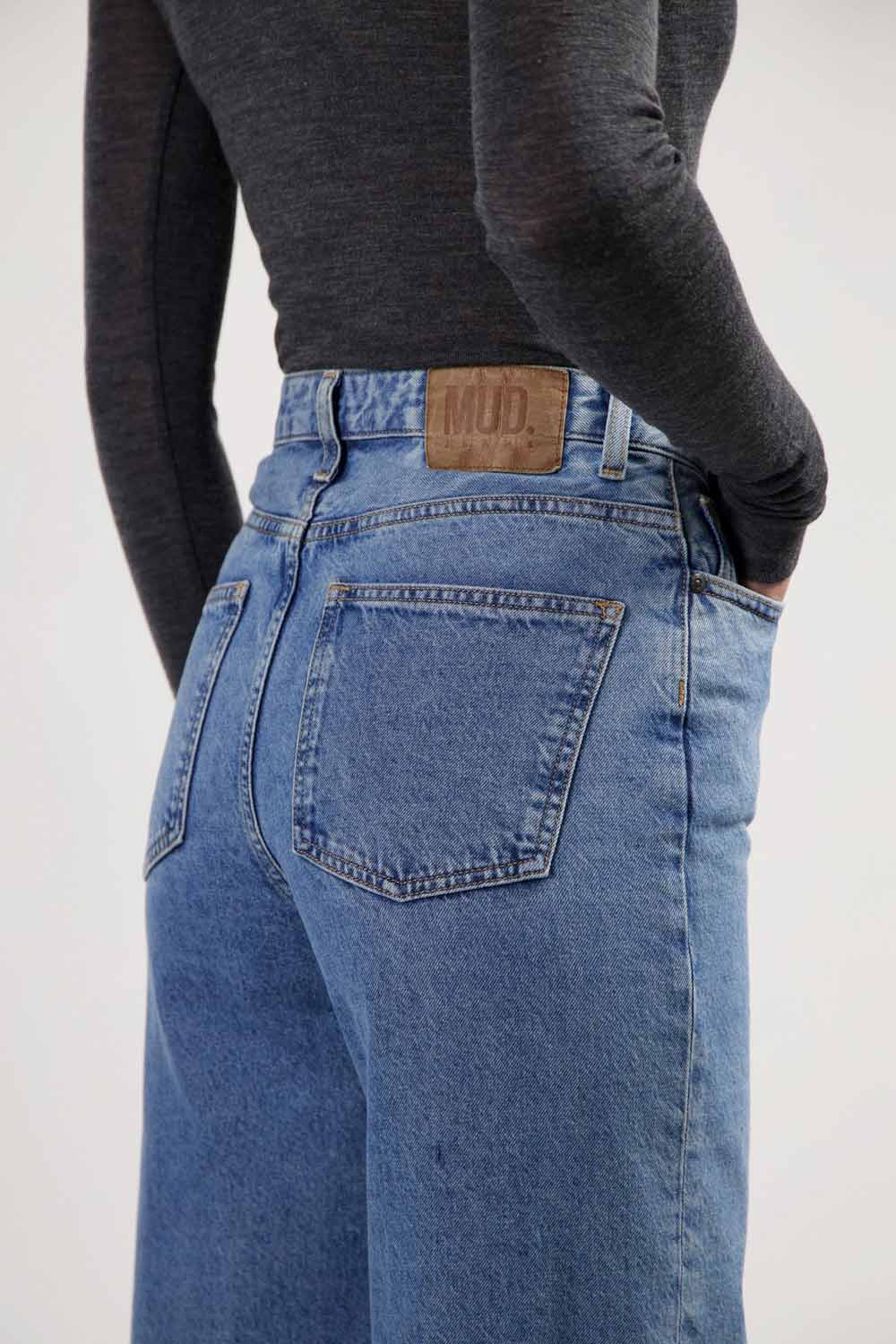 Wijde hoogvallende broek met rechte wijde pijpen. Materiaal: Non-stretch denim: 60% biologisch katoen, 40% recycled denim.