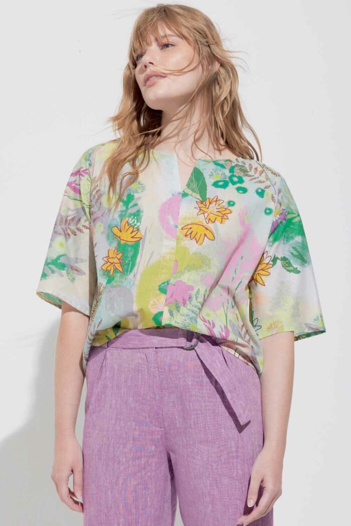 Korte broek van 50% linnen en 50% biokatoen. In de boord zit achter elastiek.