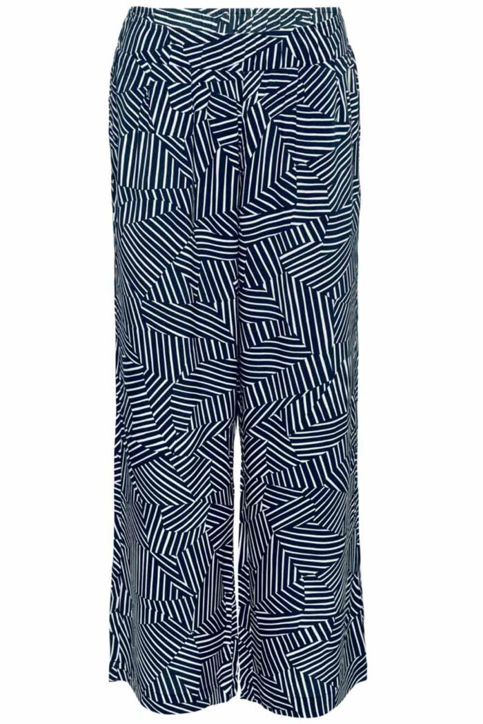 Zomerse broek met een antracietgrijze print op een ecru ondergrond. De broek is gemaakt van Ecovero en rekt dus niet mee. De heeft mooie wijde rechte pijpen tot bijna op de enkel. De broek heeft zijzakken en elastiek in de taille. Maatindicatie 40: taille = 80 cm (onuitgerekt), binnenbeenlengte = 76 cm.