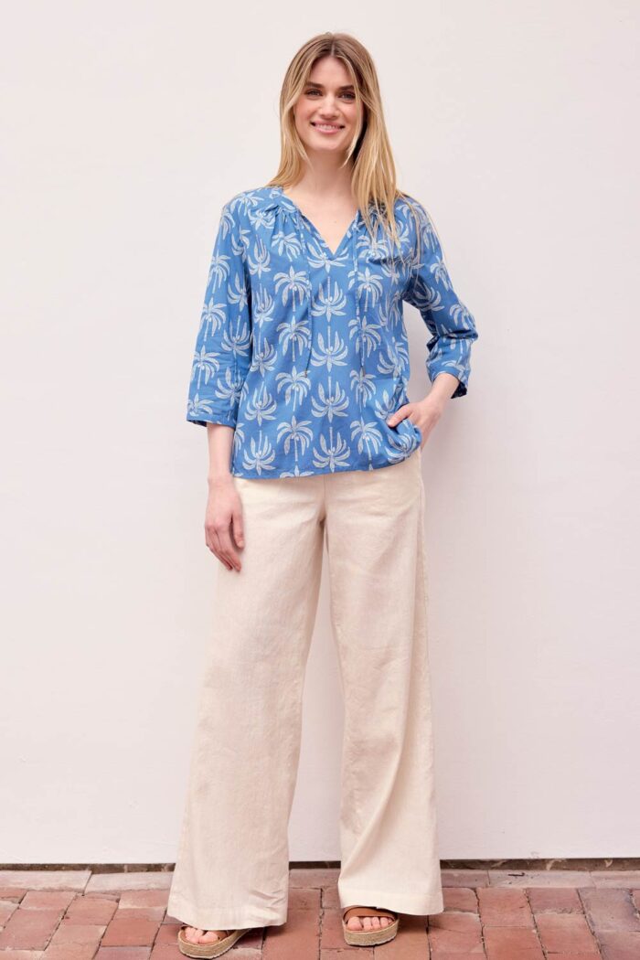 Zomerbroek met wijde pijpen van 50% linnen en 50% biokatoen. De broek heeft 4 zakken, elastiek aan de achterkant van de boord en een rits.
