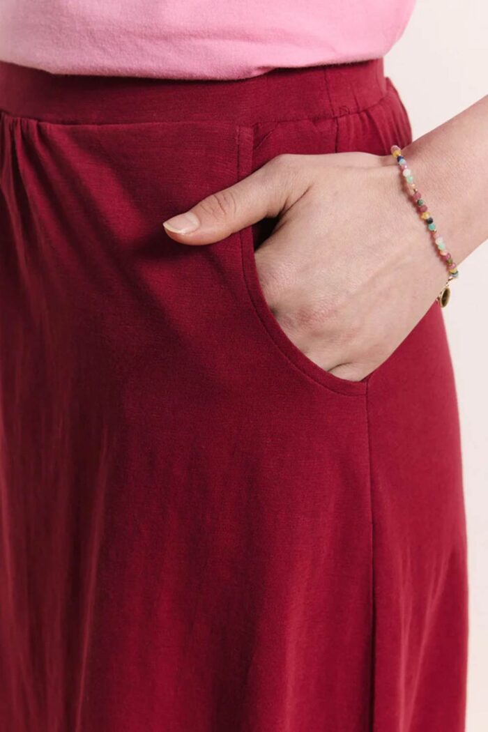 Effen rood, iets uitlopend tricot rokje met elastieken boord en zakken. Van 100% biologische slub jersey katoen. Een makkelijke basic die combineert met allerlei tops uit onze collectie.