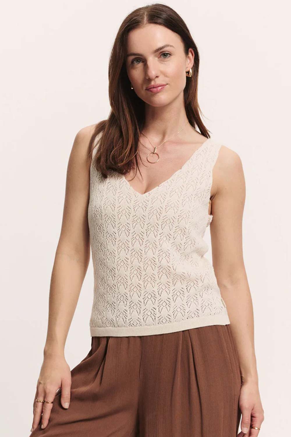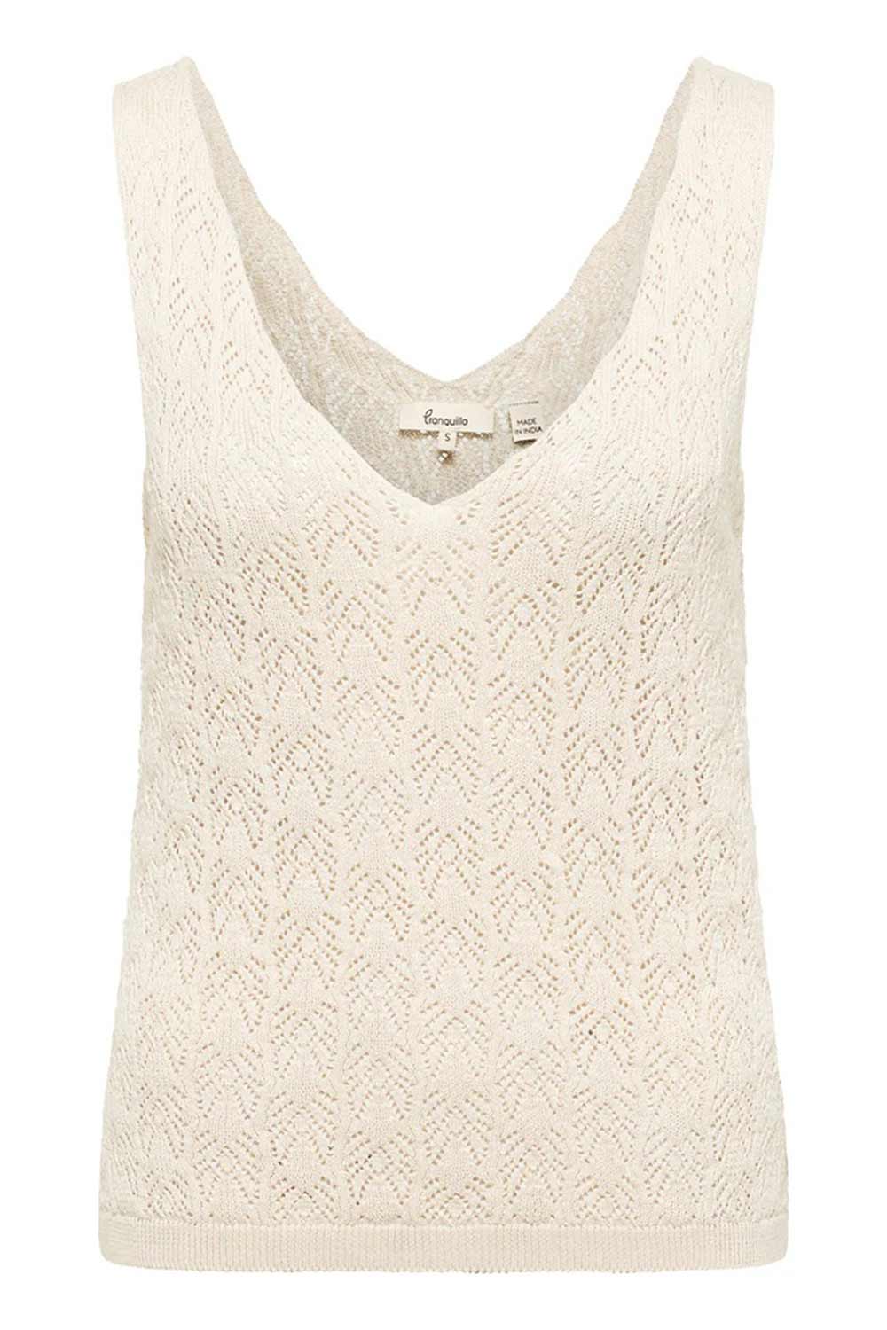Luchtig ajour gebreid hemdje van zachte biologische katoen met diepe V-hals voor en achter.