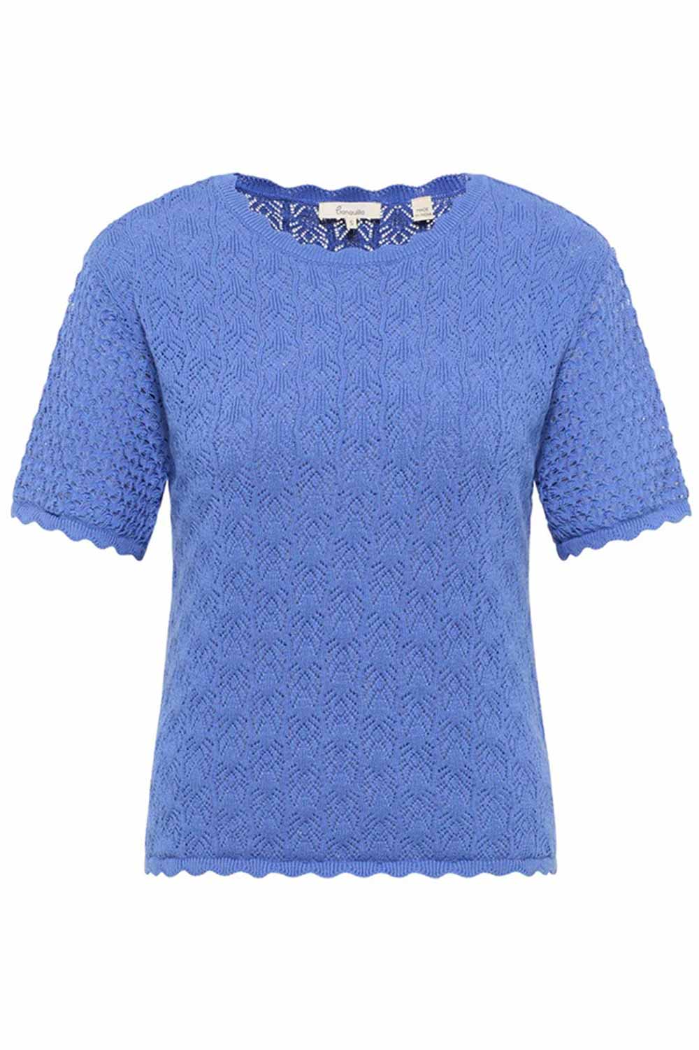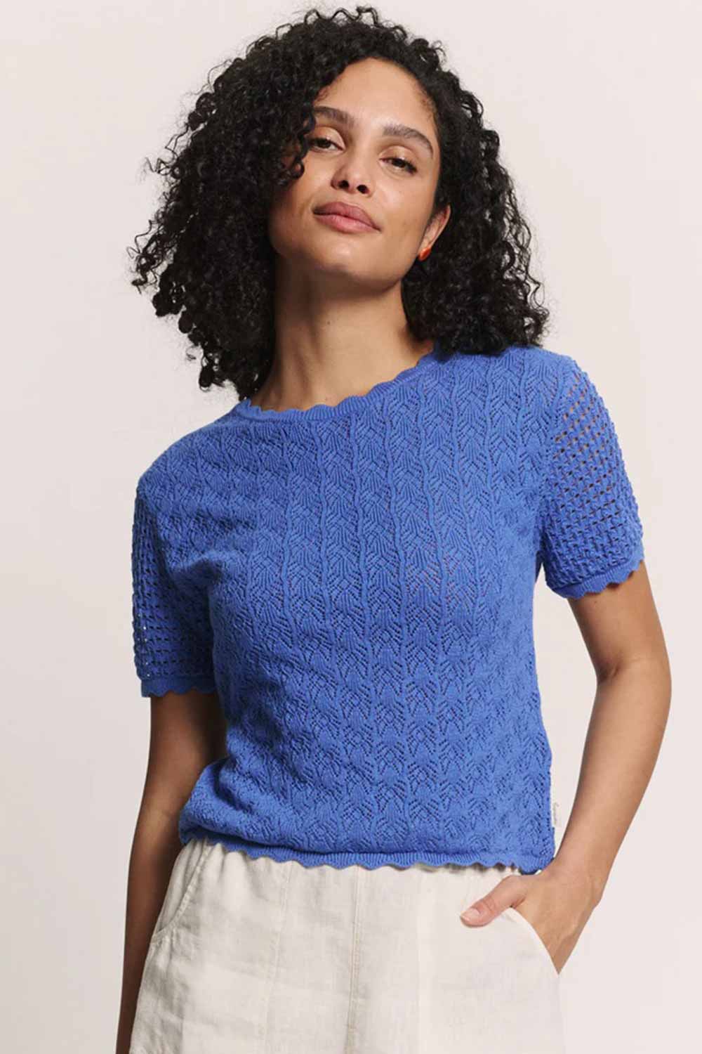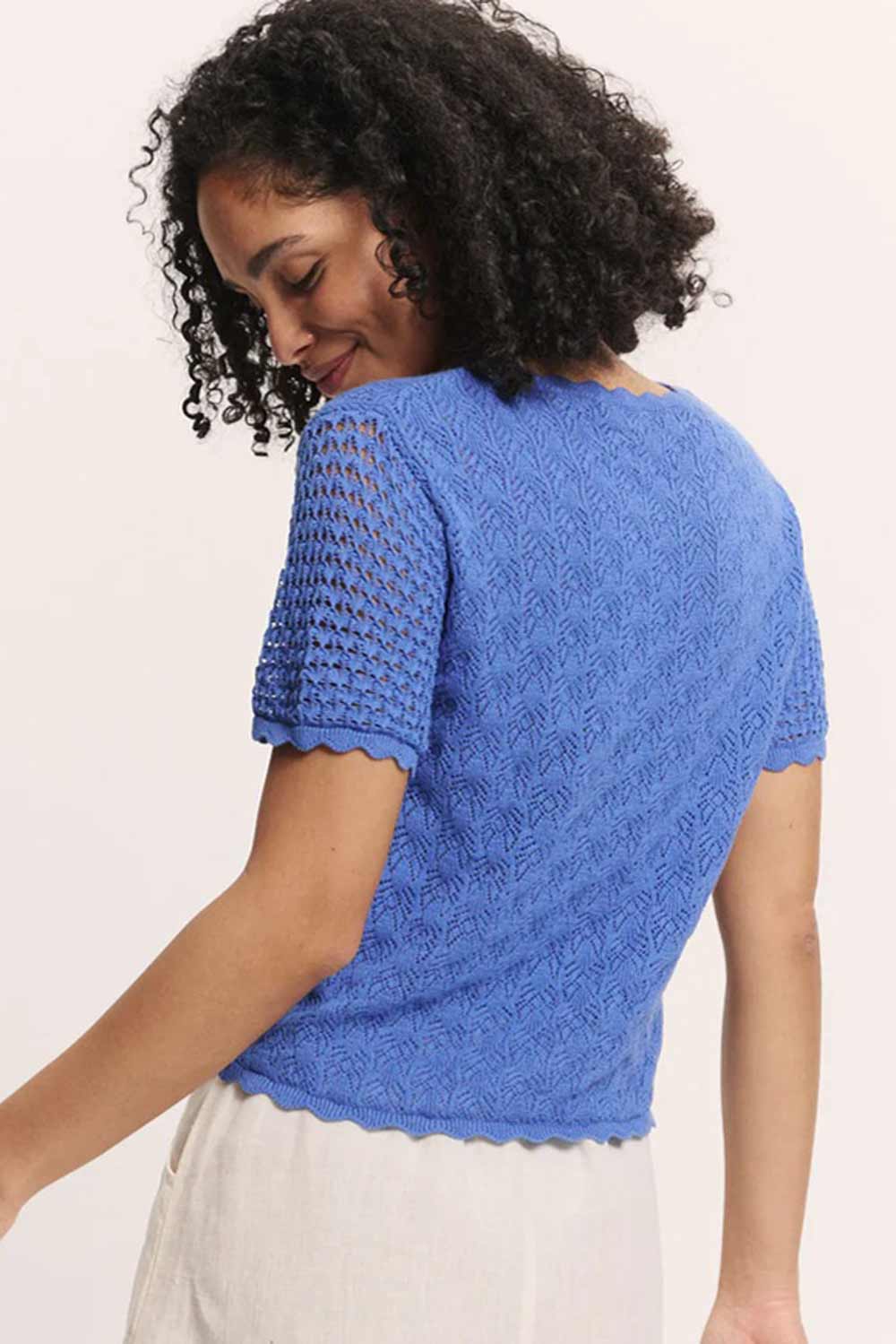 Luchtig ajour gebreid truitje van zachte biologische katoen met ronde hals en korte mouwen.