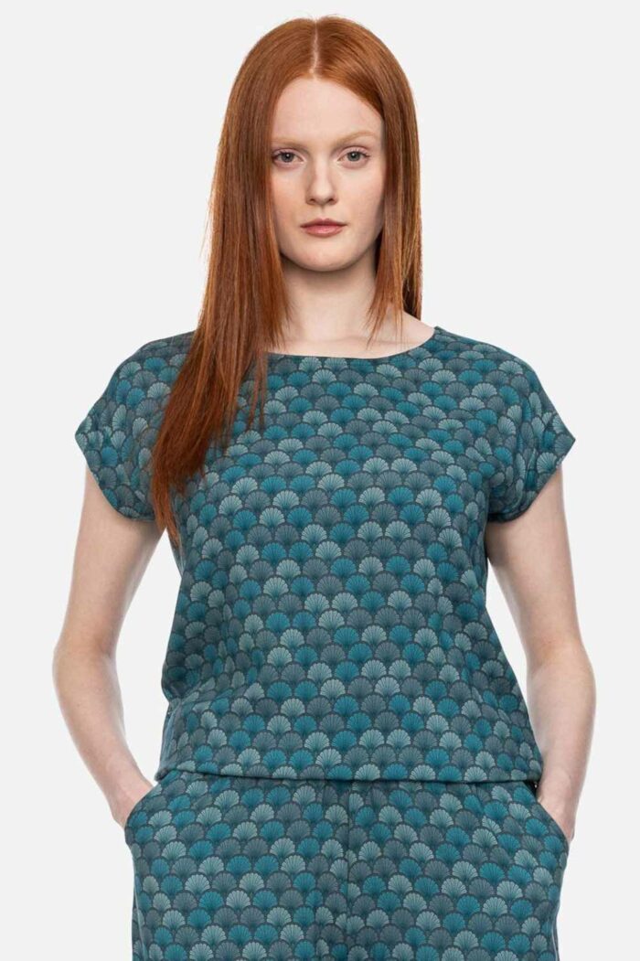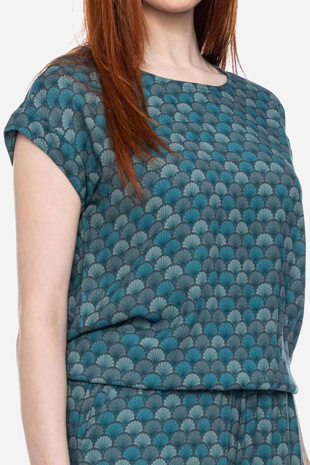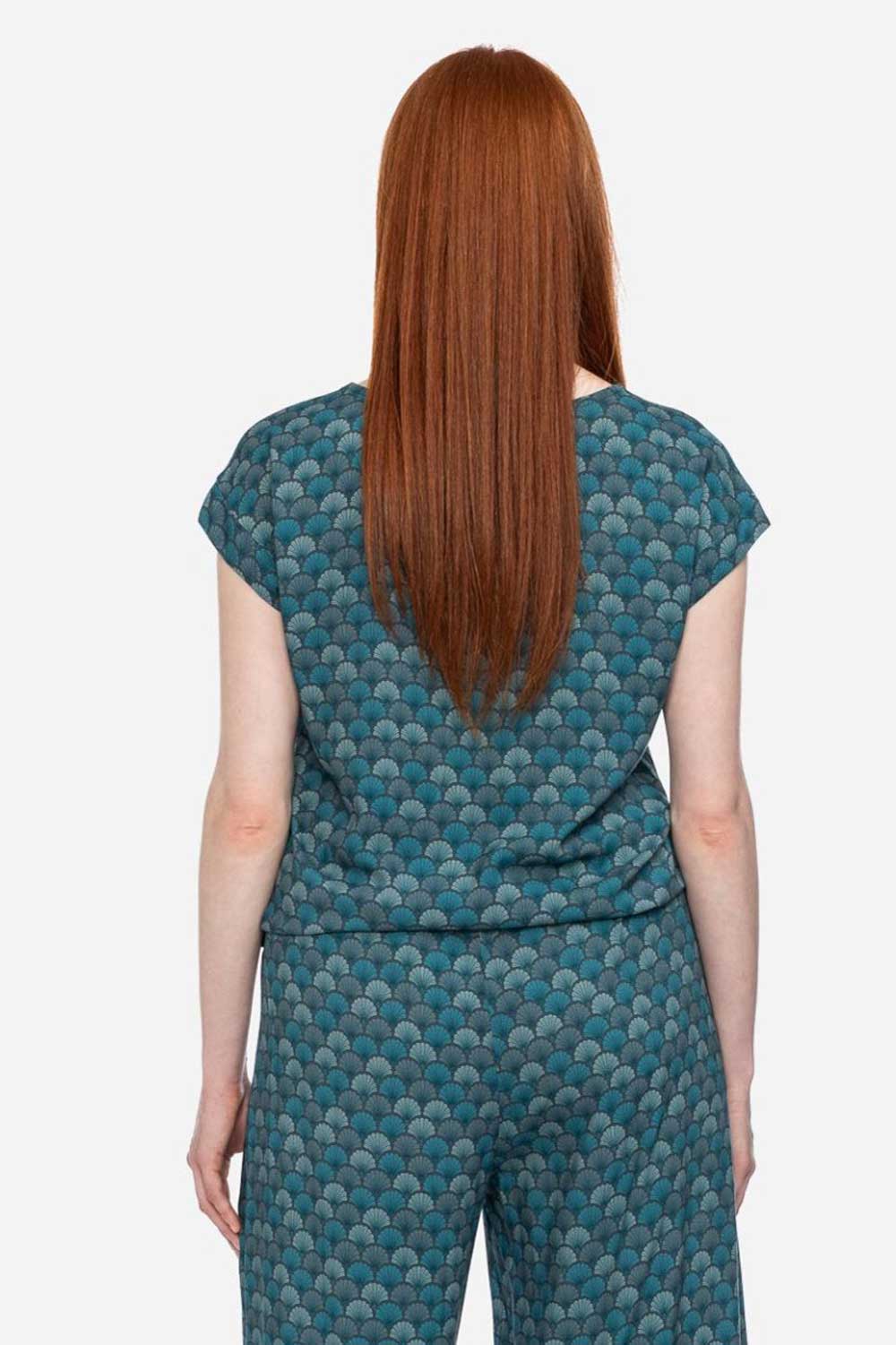 Mouwloze top van 100% ecovero viscose met een art deco print in verschillende tinten petrolblauw en groen op een antracietkleurige ondergrond. De mouwloze blouse heeft onderaan een rekbare boord.