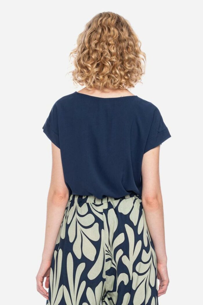 Ruimvallende blauwe top van Tencel. Het voorpand is van geweven stof, het achterpand en de mouwen van rekbare stof met 3% elastan.