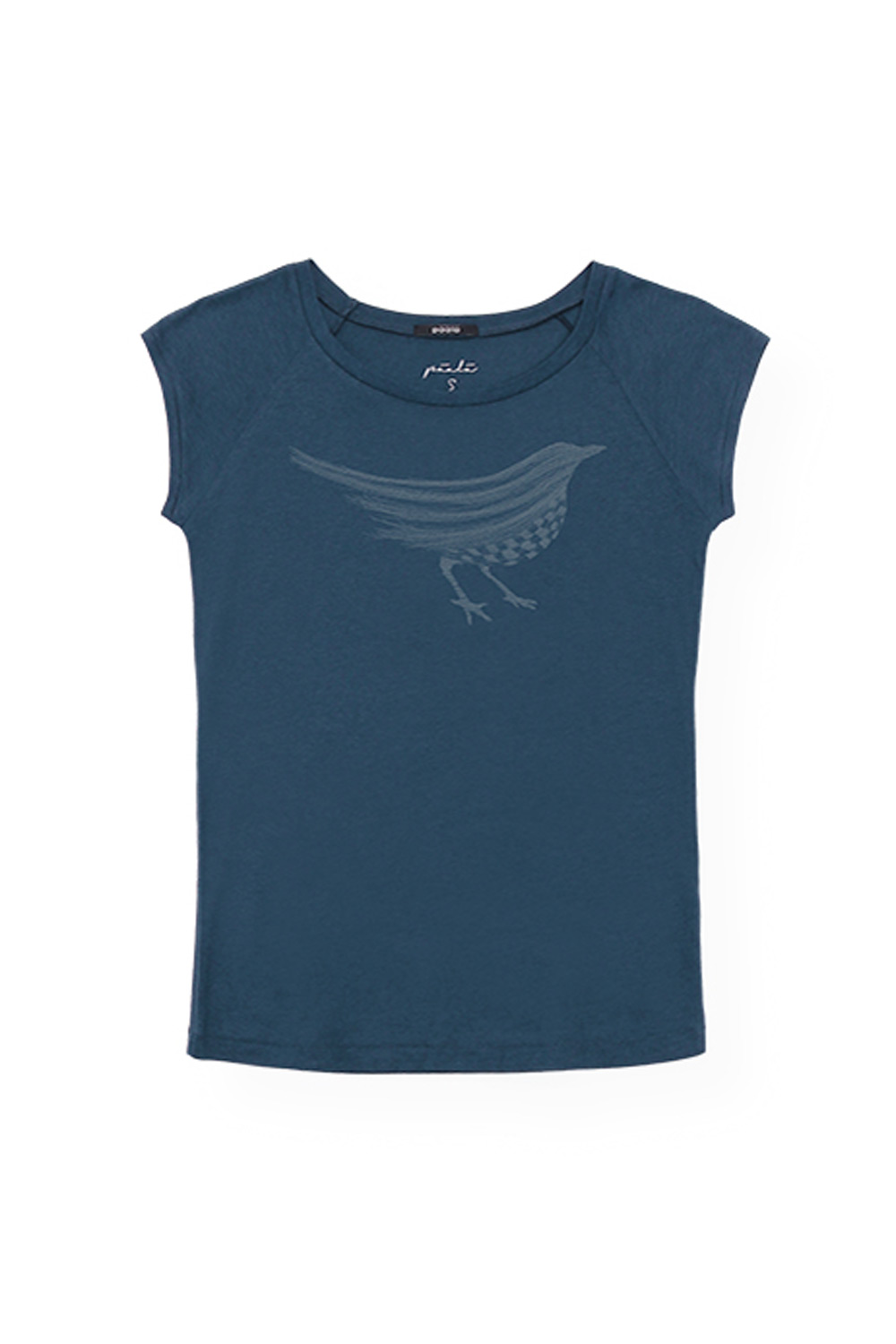 Denimblauw T-shirt met een vogelprint. Het shirt heeft een wijde ronde hals en korte raglanmouwtjes. De top heeft een aangesloten pasvorm en voelt vanwege de bamboe zacht aan.