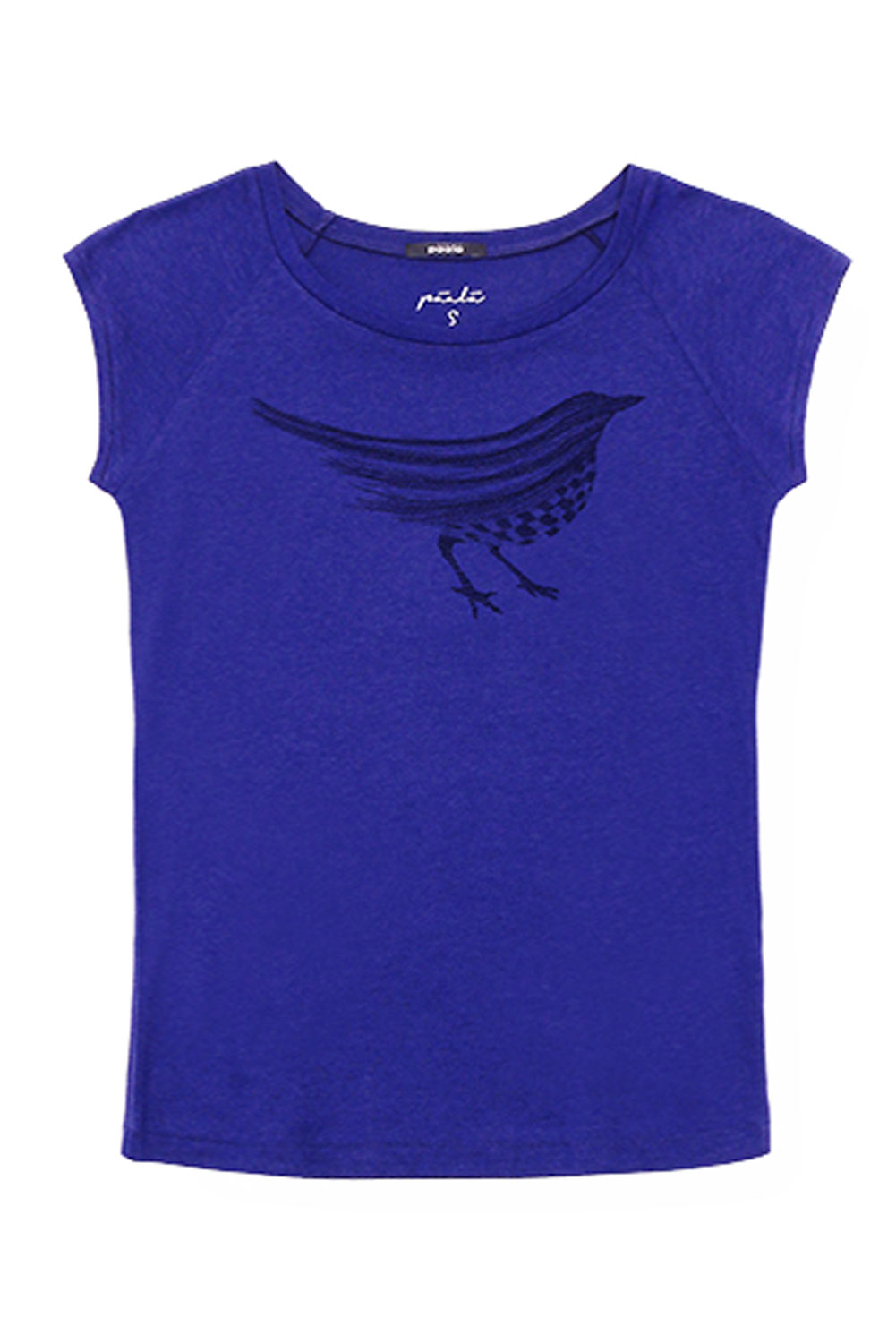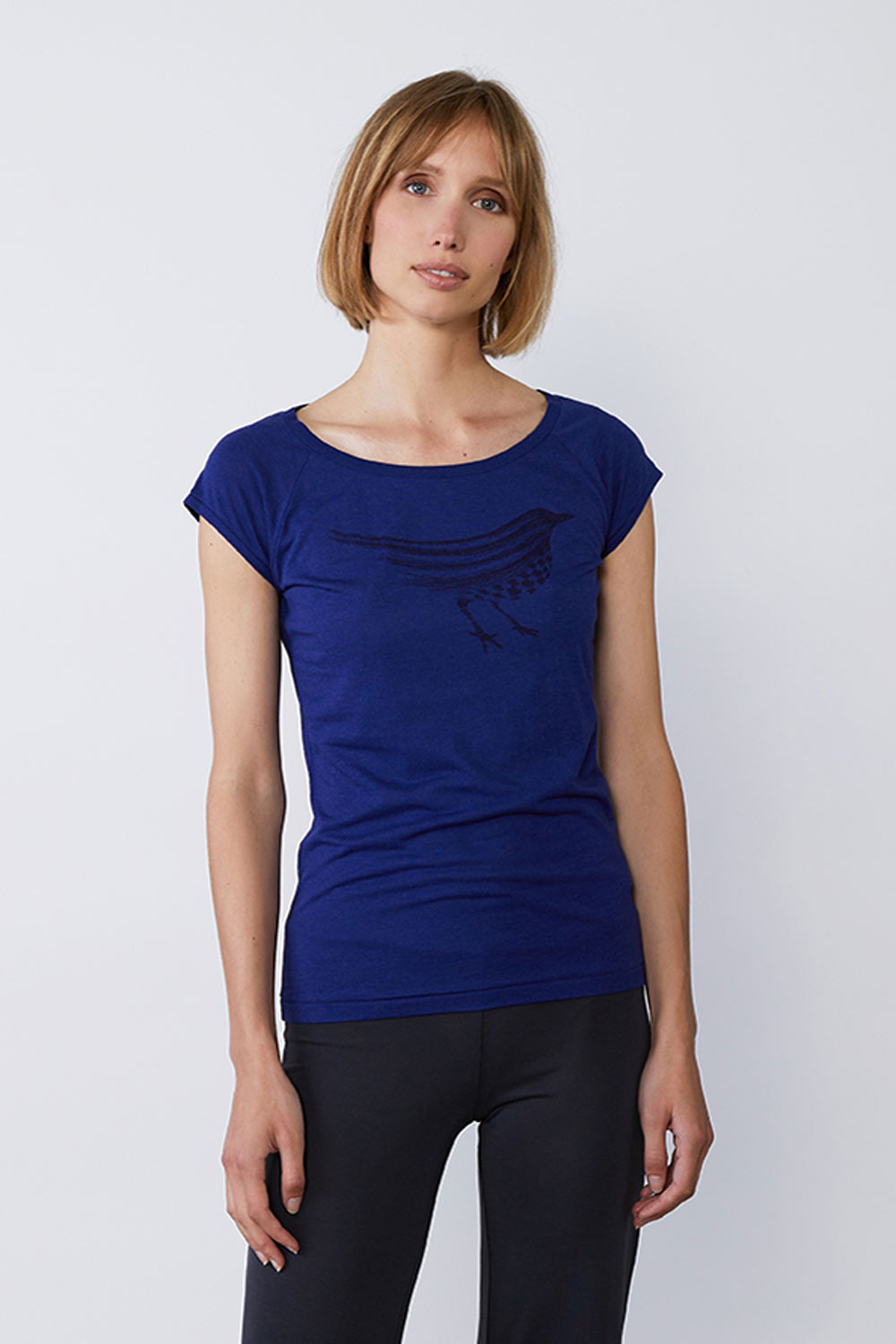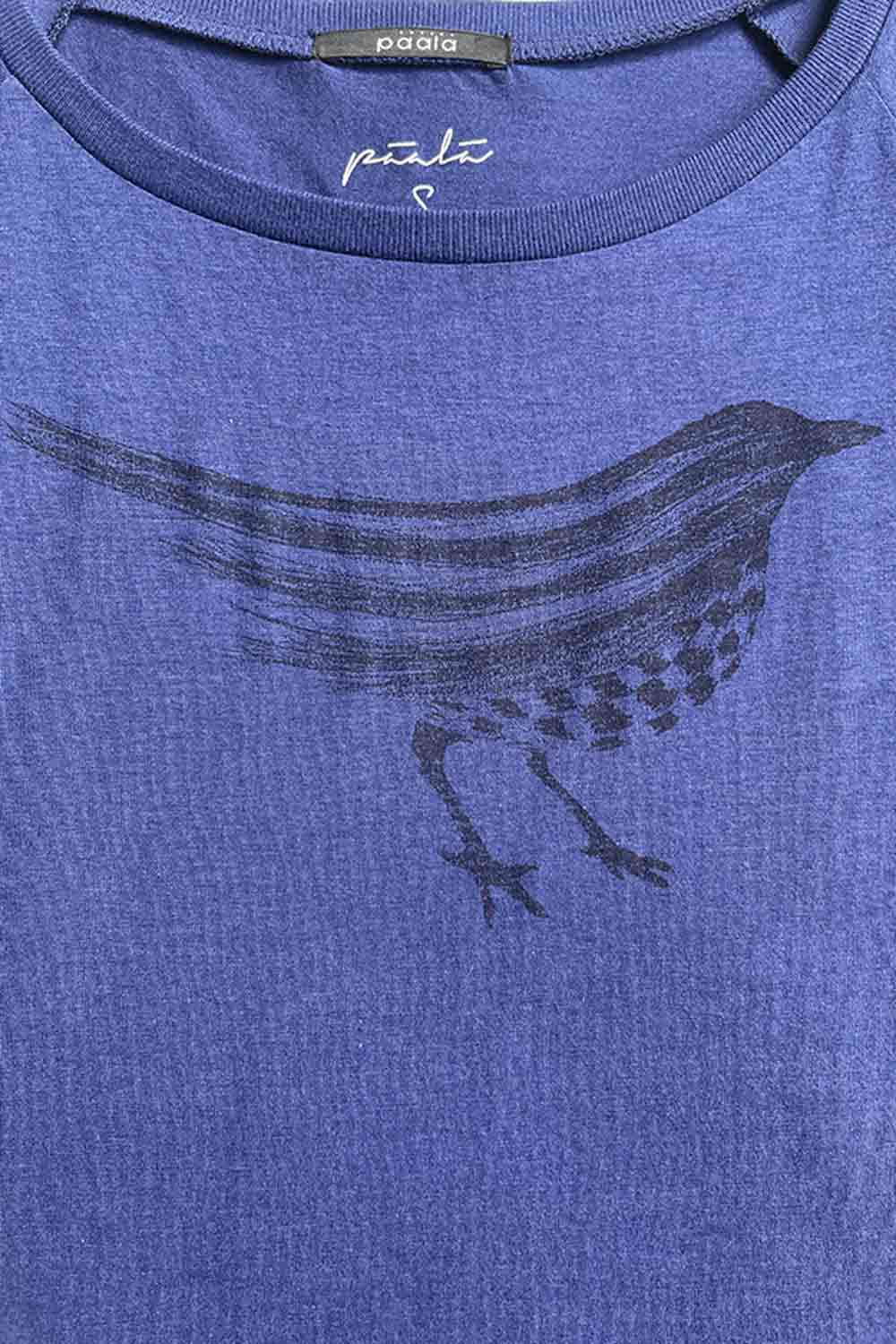 Kobaltblauw t-shirt met een vogelprint. Het shirt heeft een wijde ronde hals en korte raglanmouwtjes. De top heeft een aangesloten pasvorm en voelt vanwege de bamboe zacht aan.
