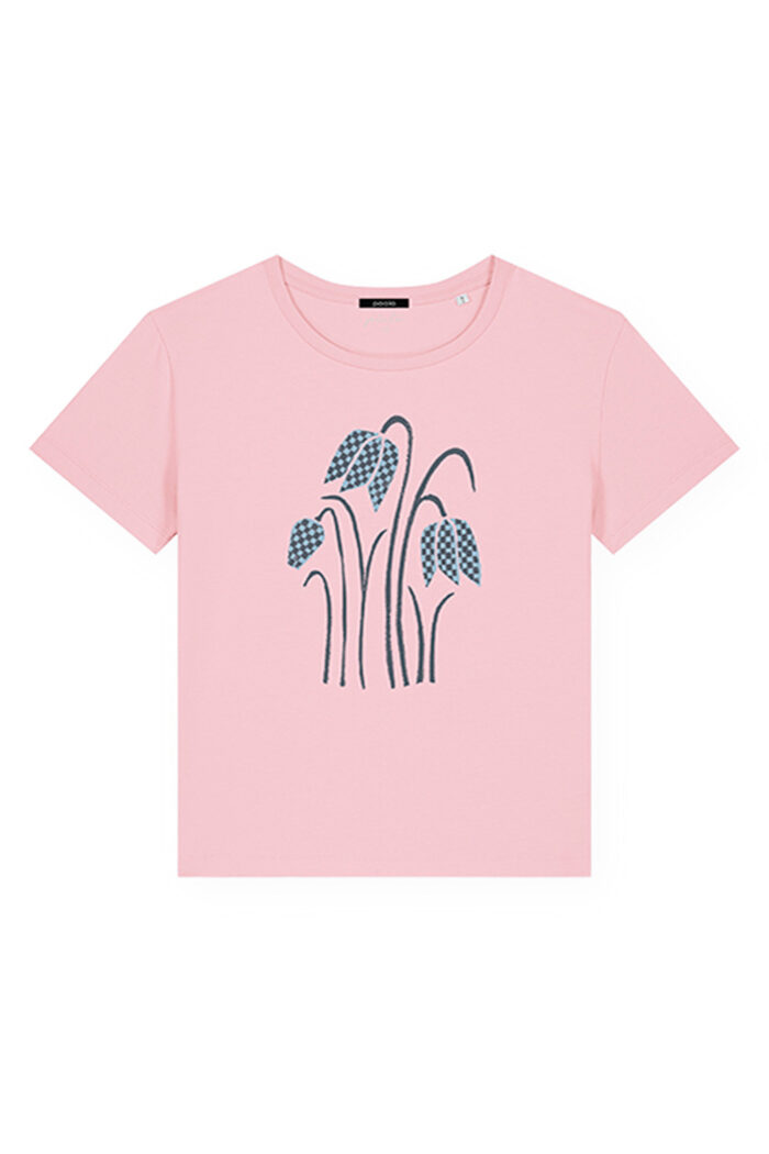 Roze t-shirt met ronde hals en blauwe print van kievitsbloemen. De top heeft een wat wijdere pasvorm.