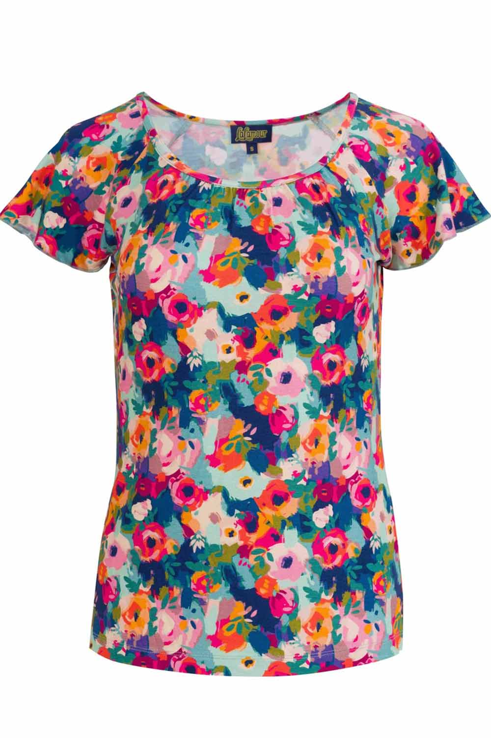 Aangesloten shirt met raglanmouwtjes en een ronde hals met subtiele plooitjes. De bloemenprint is blauw met roze en oranje. Materiaal: 95% Ecovero, 5% elastan.