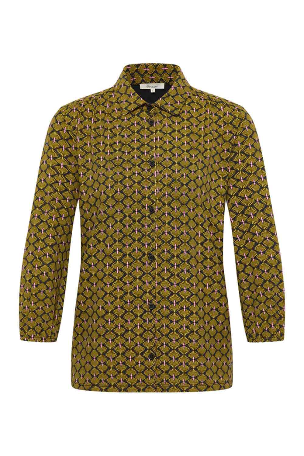 Wijder vallende doorknoop blouse met driekwart mouw van 95% Ecovero en 5% elastaan. Heeft een kraag en onderaan het mouwtje een elastieken boordje, zodat de mouw een beetje poft. De art deco print bestaat uit geel-roze ‘waaiers’ op een zwarte ondergrond. De rekbare stof is wat zwaarder dan van gemiddelde bloesjes, dus de top is vooral geschikt voor de koelere dagen.