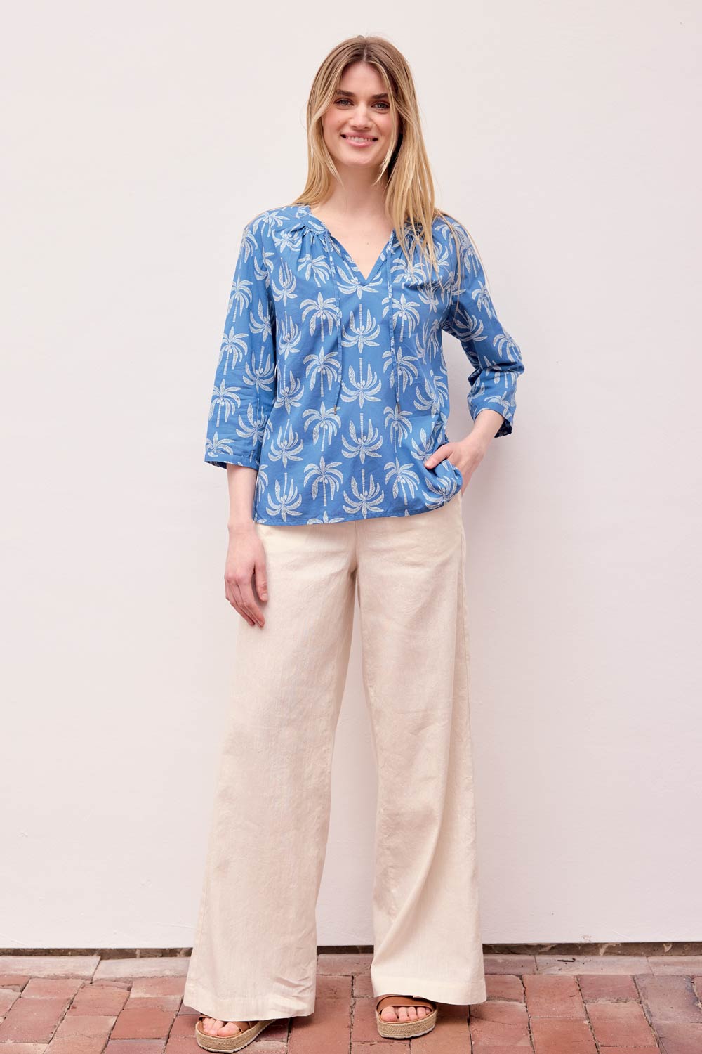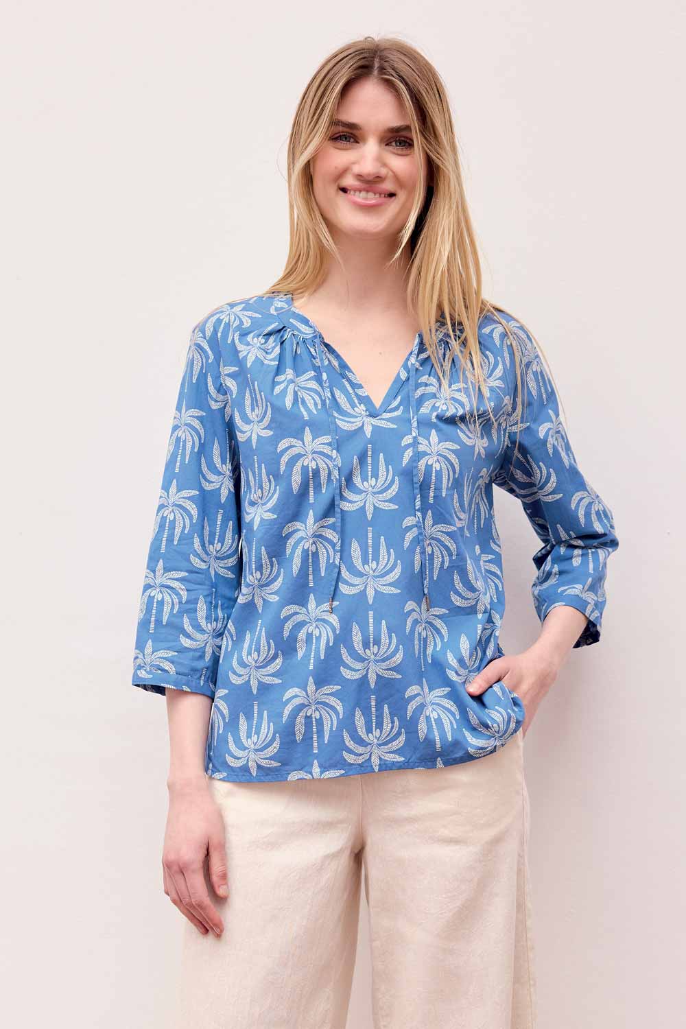 Dunne blouse van 100% biokatoen met palmenprint. De bloes heeft driekwart mouwen, een strikje bij de hals en een bandje met knoopje om de mouw korter te maken. Maatindicatie maat 40: bovenwijdte = 108 cm, lengte = 68 cm, mouwlengte = 43 cm.
