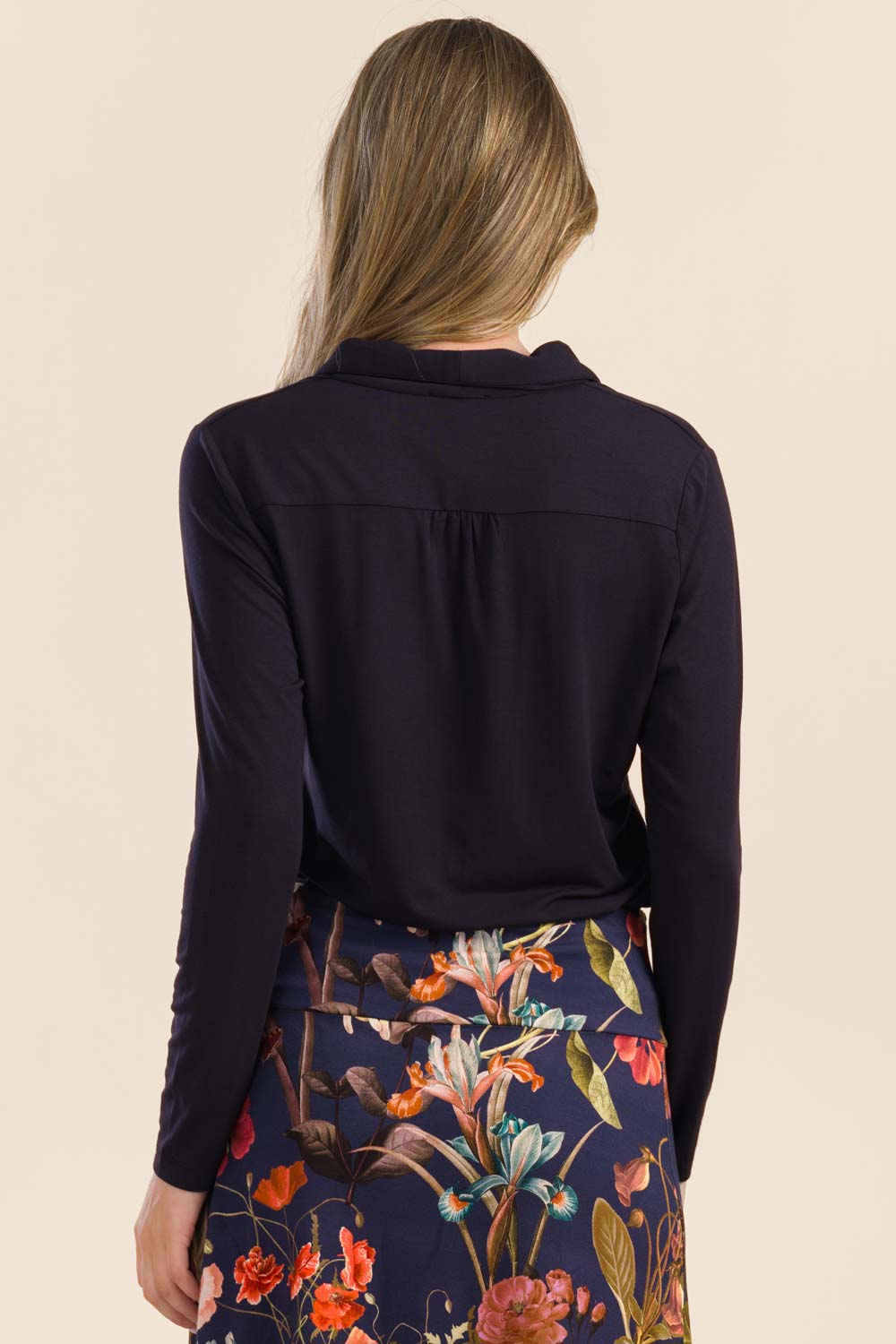 Blouse van 95% micromodal/tencerl met 5% elastan in effen zwart dat perfect bij de prints van dit merk past. De bloes heeft lange mouwen en een sjaalkraag.