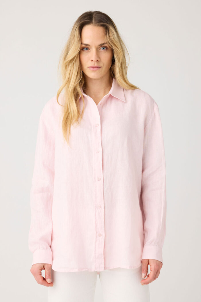 Loose-fit blouse van 100% biologisch linnen. De lichtroze bloes draagt heerlijk luchtig en biedt tegelijk bescherming tegen de zon.