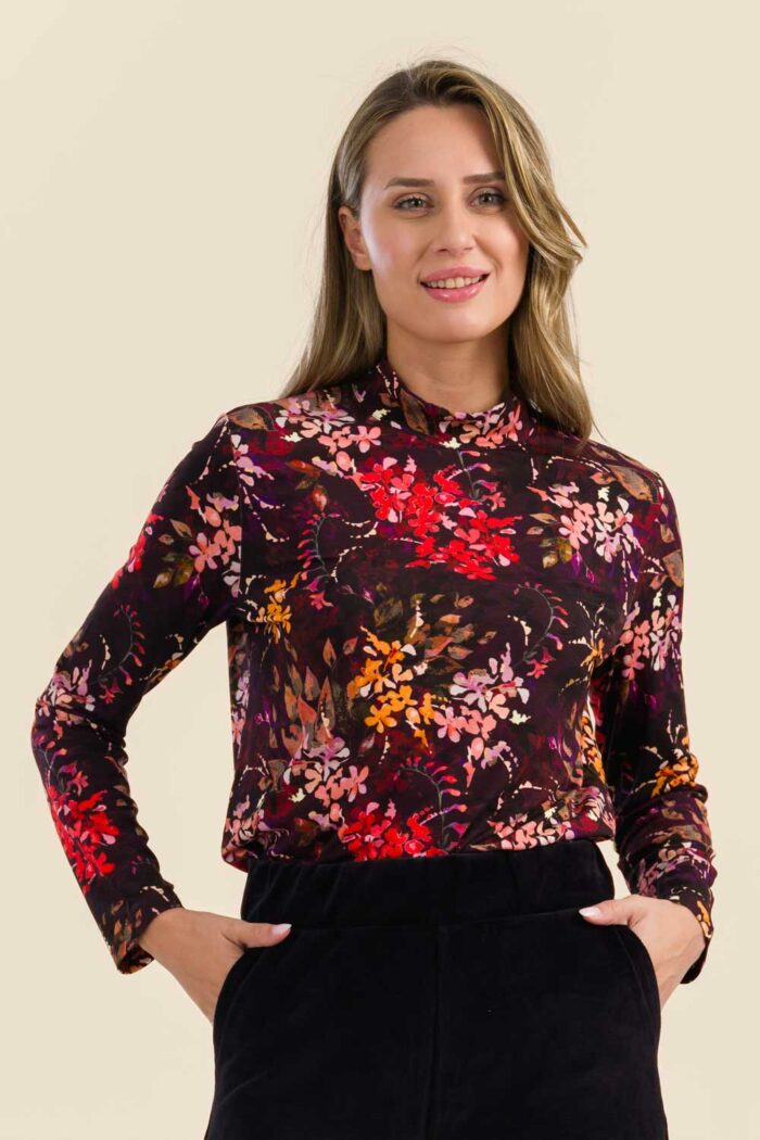 Top met lange mouwen en een opstaand boordje van 95% ecovero met 5% elastan. Het shirt heeft achter bij de boord in de nek een splitje met twee kleine knoopjes.