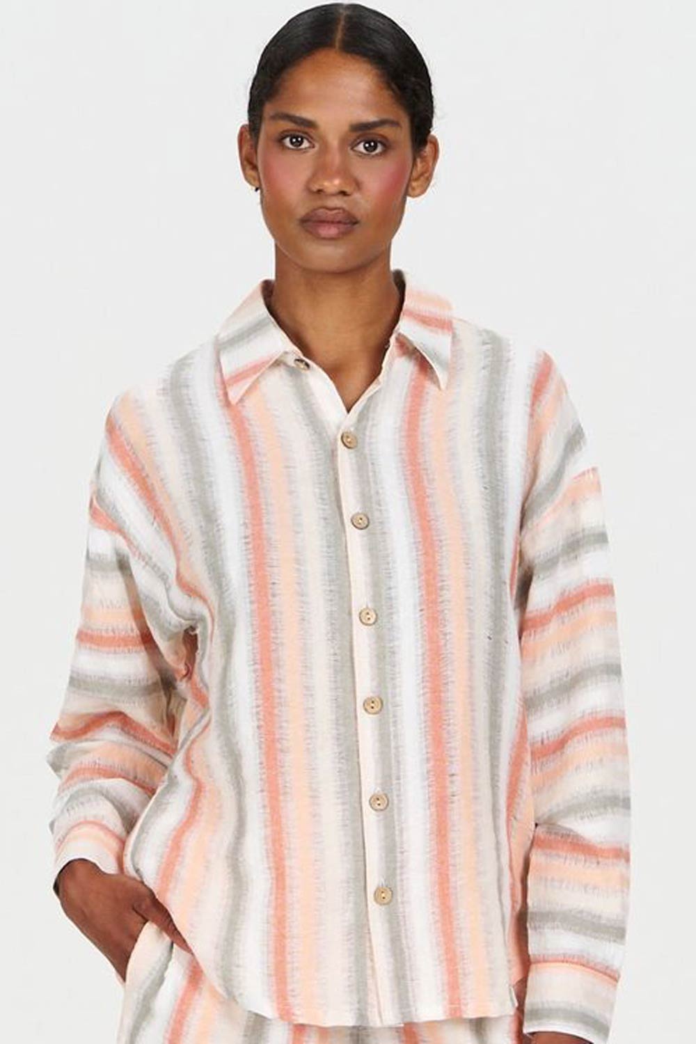 Zomerse gestreepte blouse van 100% biologische katoen. De delicate stof is luchtig geweven en deels doorzichtig. (Wasadvies: fijnwas op 30 graden in een waszakje). De blouse heeft houten knopen en kleine splitjes aan de zijkant.