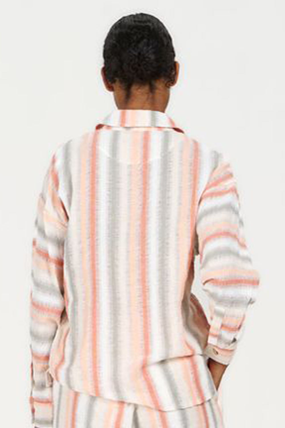 Je kunt deze top zowel sportief als netjes dragen. Op een zomerse dag is het heerlijk dat de blouse lekker luchtig is. De strepen zijn perzikroze, steenrood, saliegroen, creme en wit.