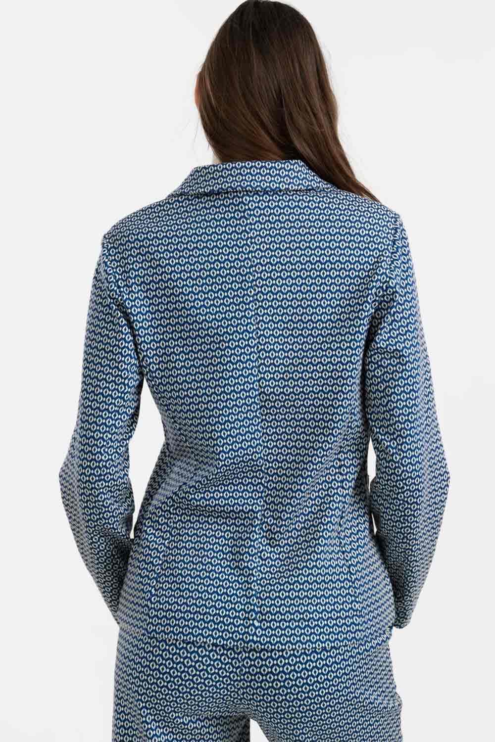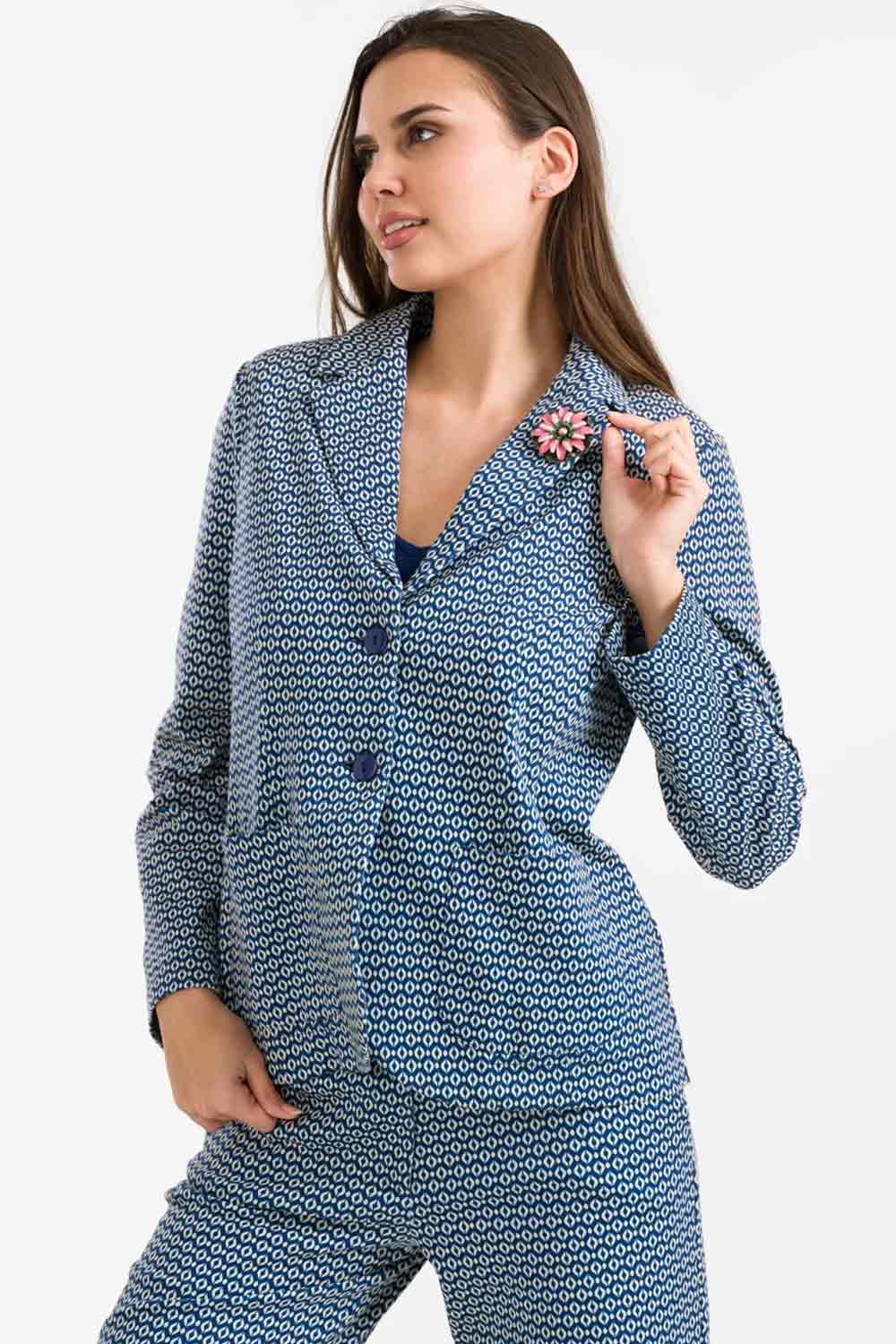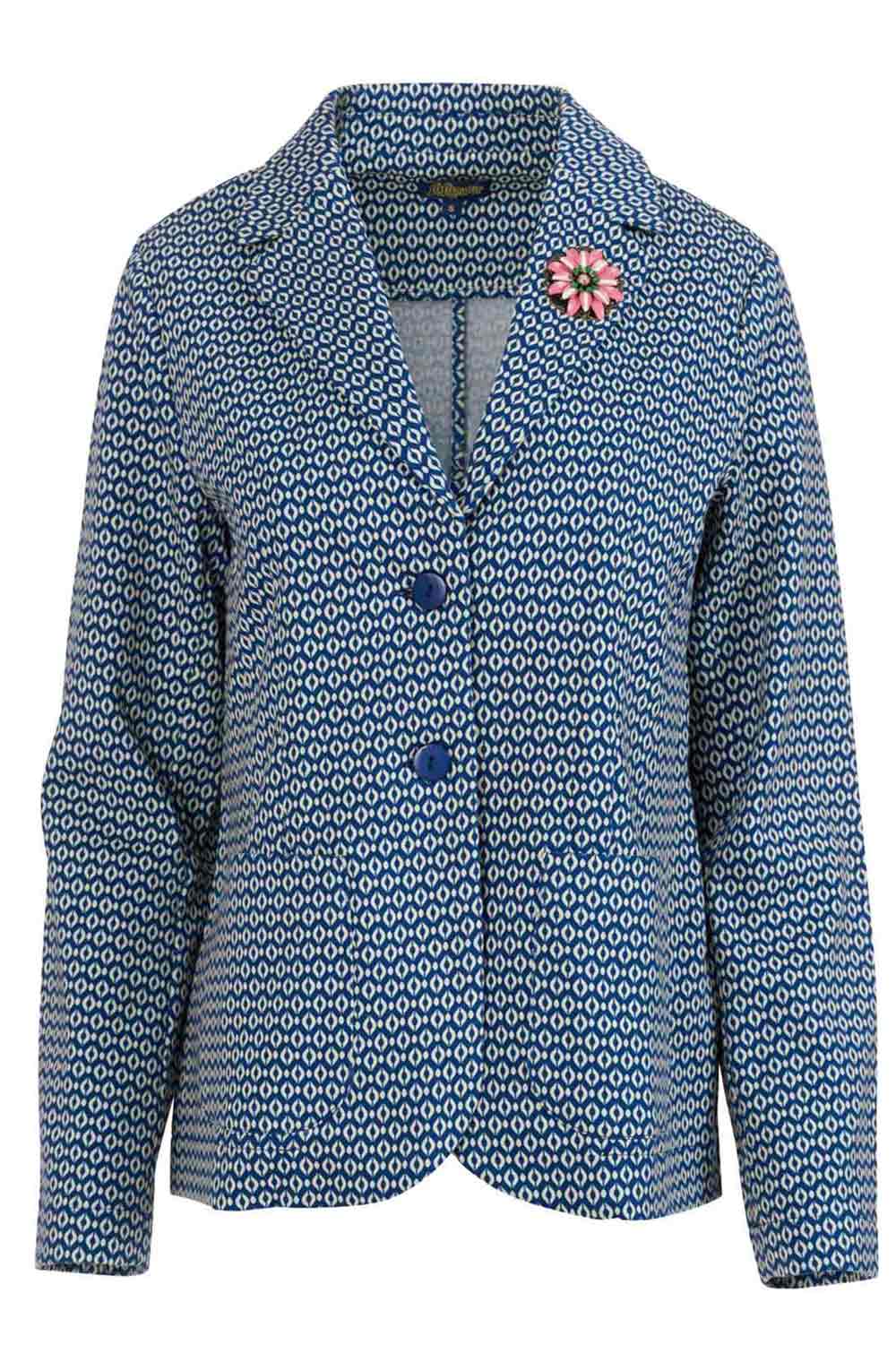 Getailleerde blazer van 88% biologische katoen, 10% recycled polyester en 2% elastan. Het colbertje heeft 2 knopen en 2 opgestikte zakken. De roze bloembroche hoort erbij en kan er ook af om bv. als haarklip te gebruiken.