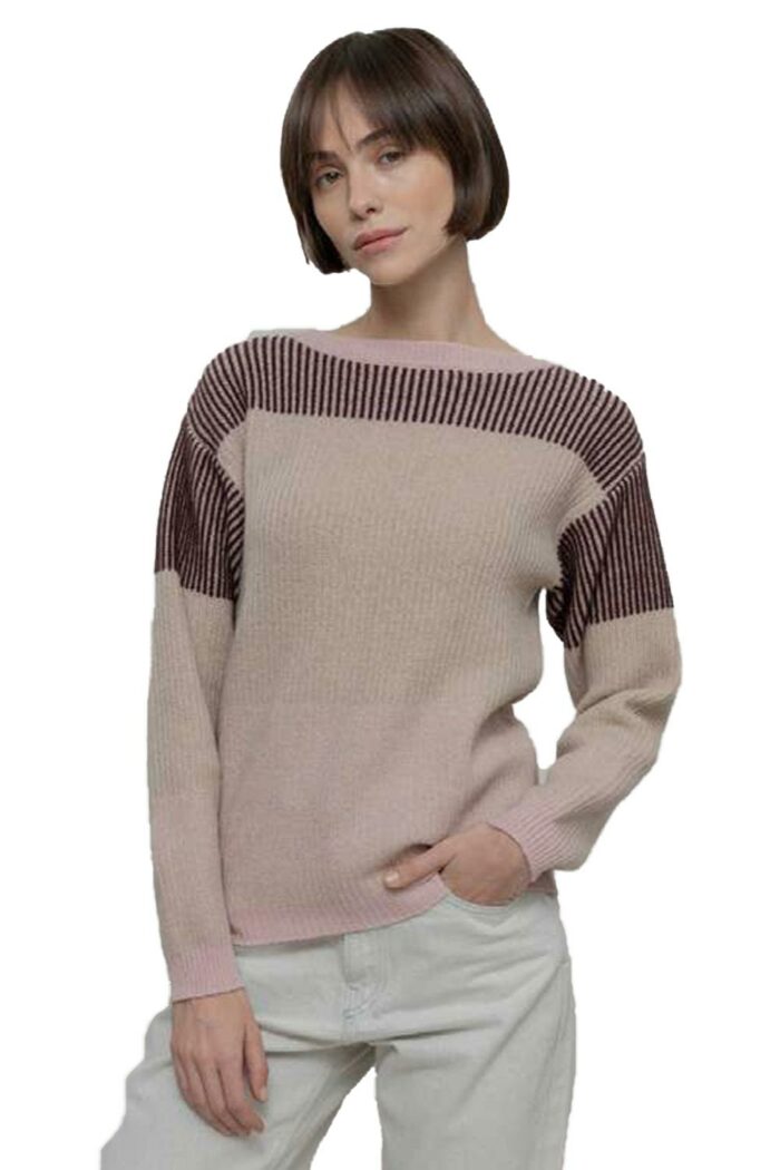 Beige/roze/aubergine trui met ronde hals in streeppatroon van gerecycled kasjmier.
