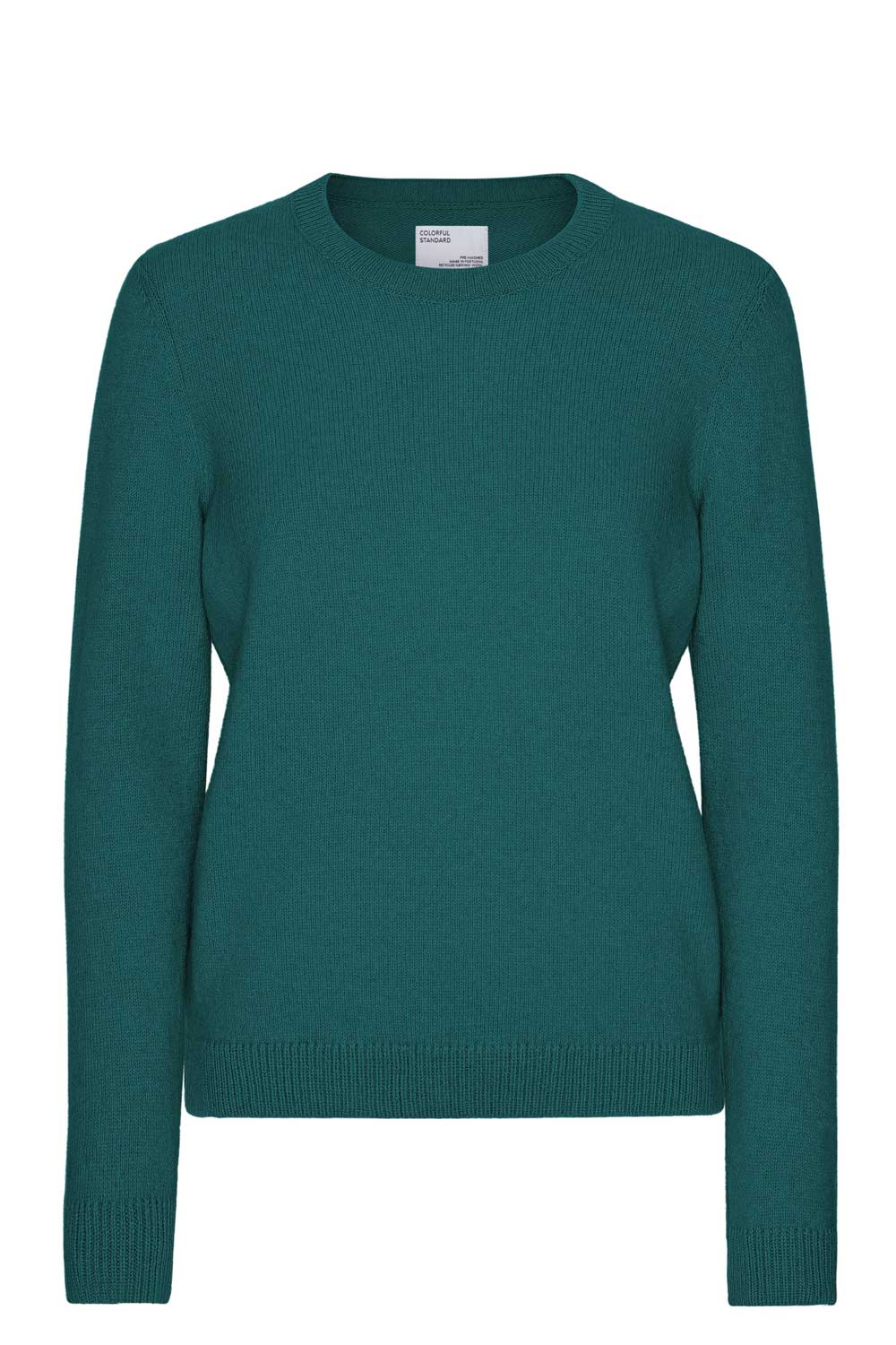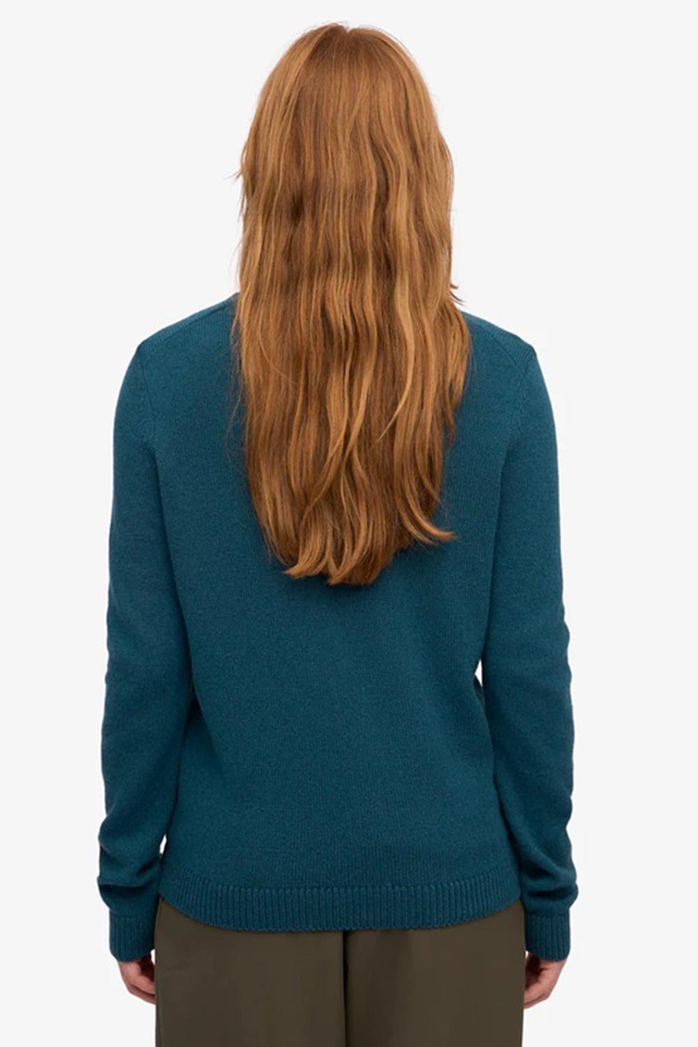 Petrolkleurige trui van gerecyclede merinowol. De regular-fit trui heeft een aansluitende ronde hals. De hals en de andere boorden zijn een beetje elastisch, waardoor de trui goed in model lijkt te blijven.