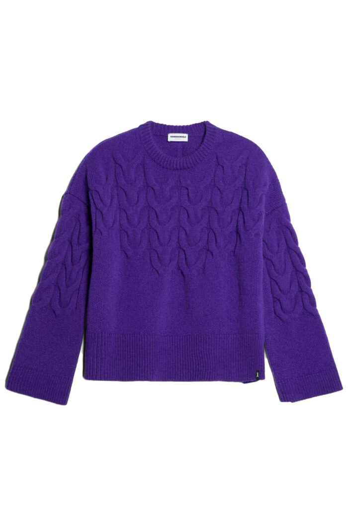 Dikke, korte, paarse kabeltrui van 50% gerecyclede en 50% biologische wol. De trui heeft een ronde hals. De lange mouwen eindigen wijd, zonder manchet. Alles aan deze trui is lekker opvallend: de kabels die halverwege ophouden, de felle kleur. De oversized trui is een echte eyecatcher.