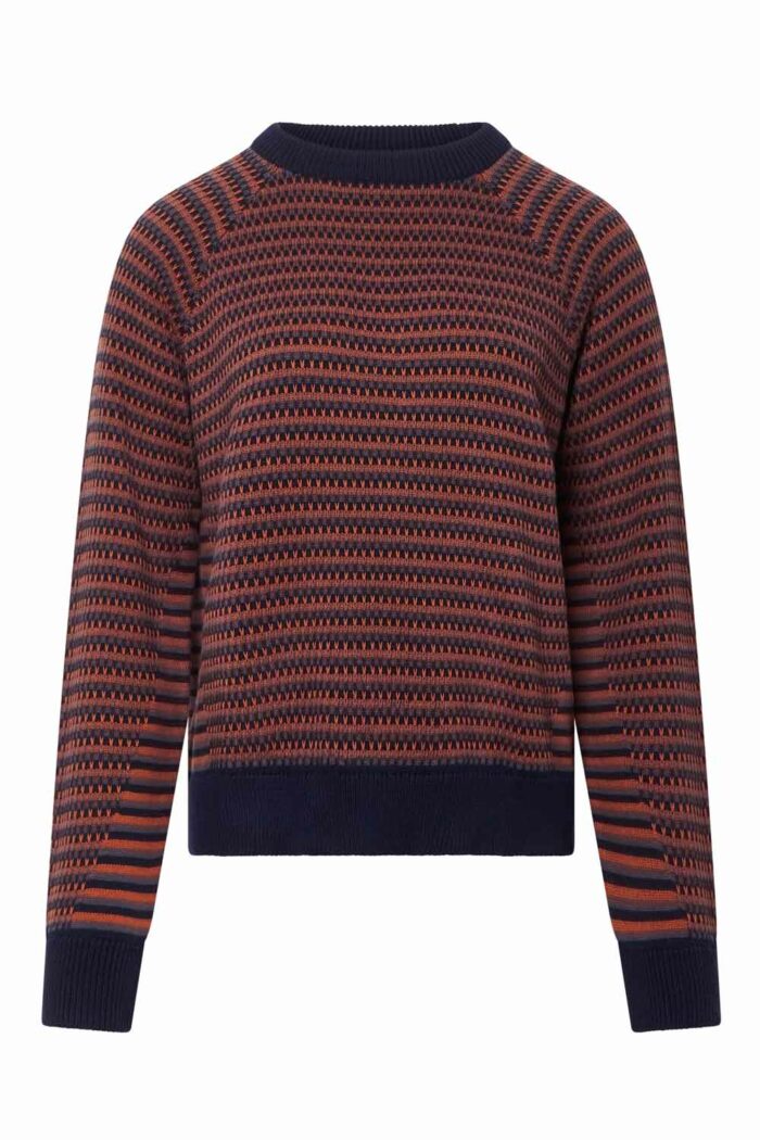 Biokatoenen trui met hoge ronde hals in blauw met oranje-bruin blokjes/strepen.