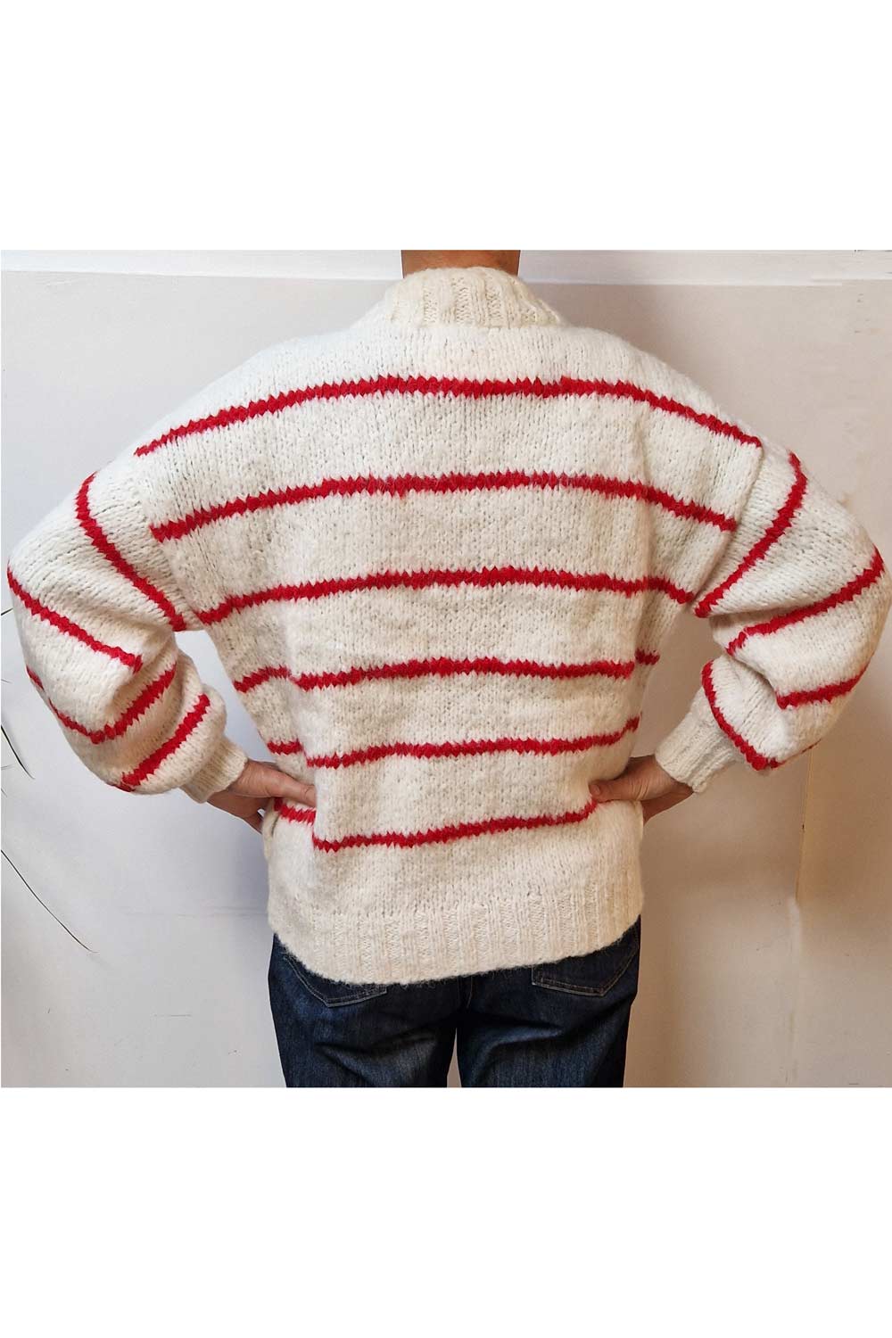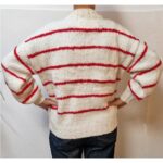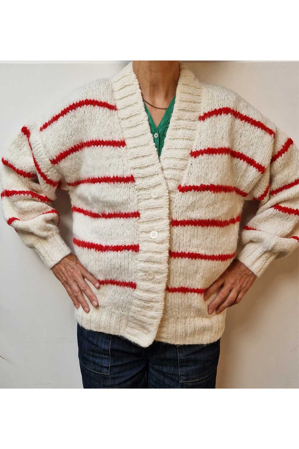 Kort getailleerd vest van baby-alpaca (de meest zachte wol van een alpaca) met met v-hals en knopen. De ondergrond is ecru en er zijn rode strepen ingebreid. Er zitten zakken in de zijnaad.