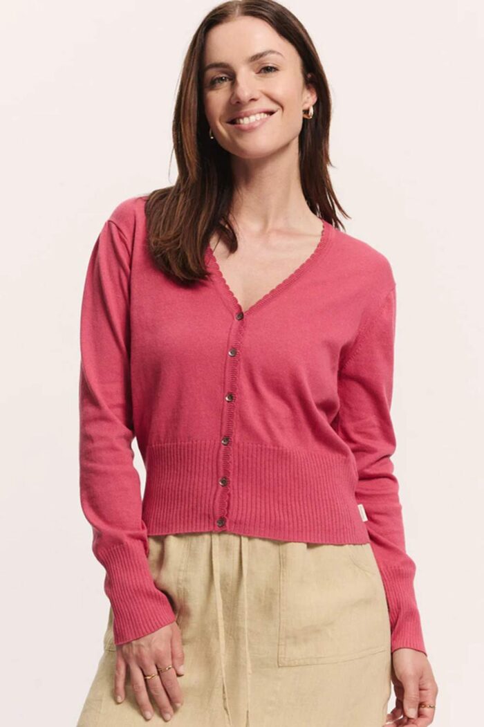 Kort roze vestje van 100% biokatoen met pofmouwen, v-hals en parelmoeren knoopjes. Door de boord heel geschikt om op rokjes, jurken en hoog sluitende broeken te dragen. Het vestje zit redelijk aangesloten, wil je er nog blouses onder kunnen dragen, overweeg dan een maatje groter te nemen.