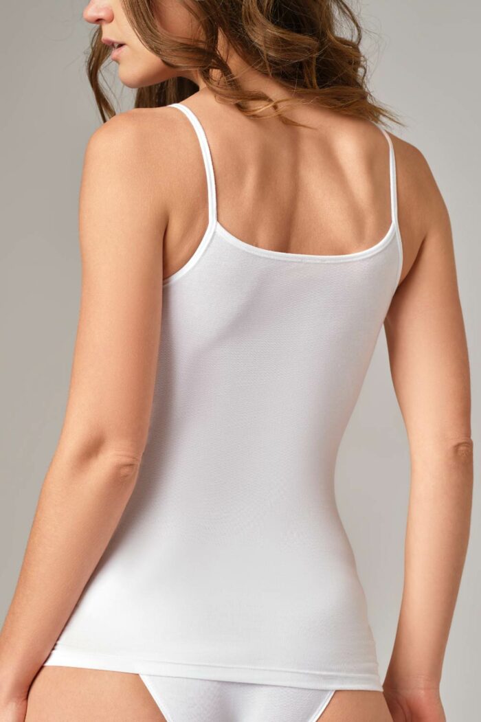 Heerlijk zacht lichtgroen spaghettihemdje van 92% biokatoen en 8% elastaan. Om het draagcomfort verder te verhogen, heeft de top geen zijnaden.