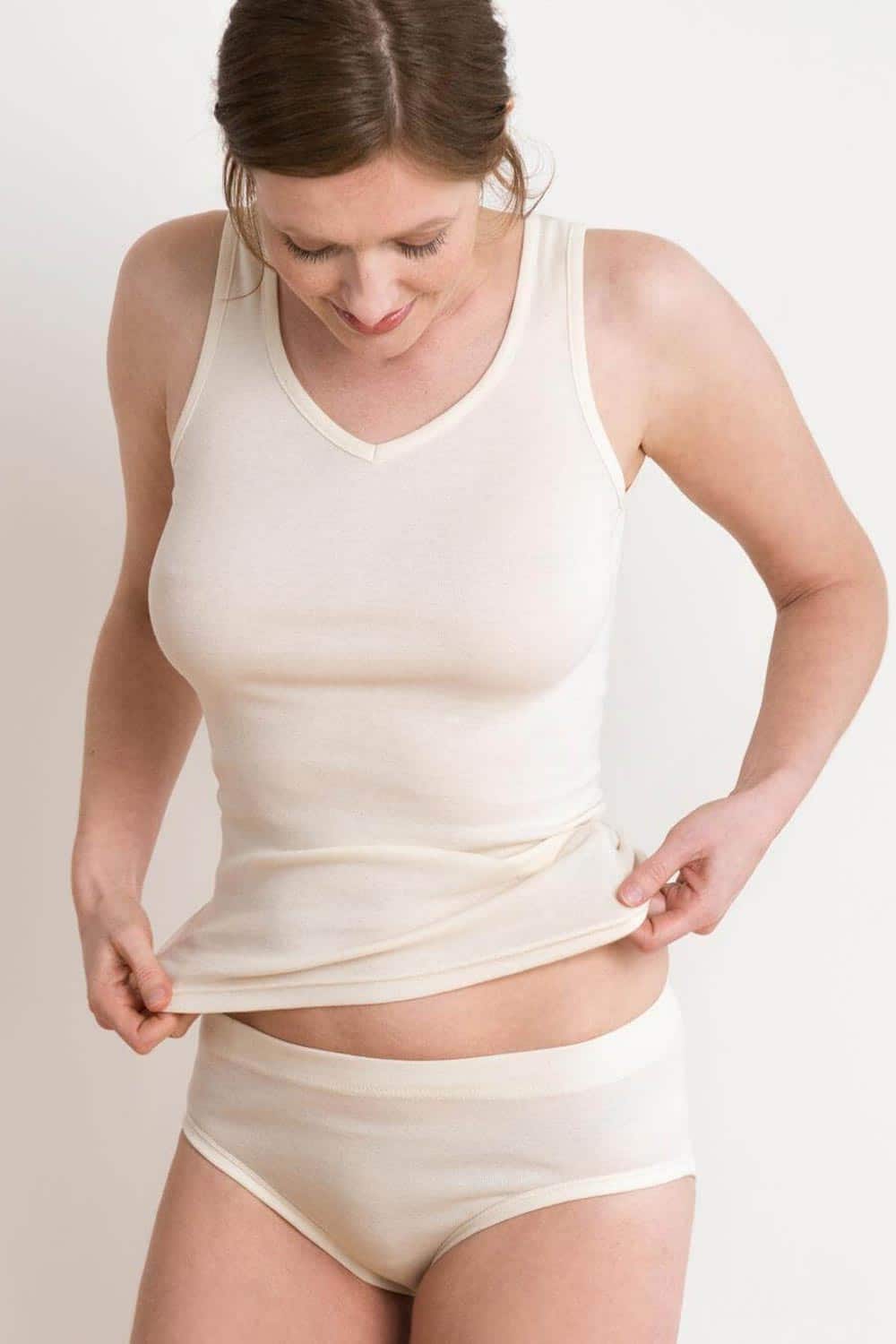 Basic biokatoenen ondergoed voor dames: niet al te hoog uitgesneden tailleslip in aangename fijnrib kwaliteit en zonder zijnaden, met te vernieuwen elastiek.