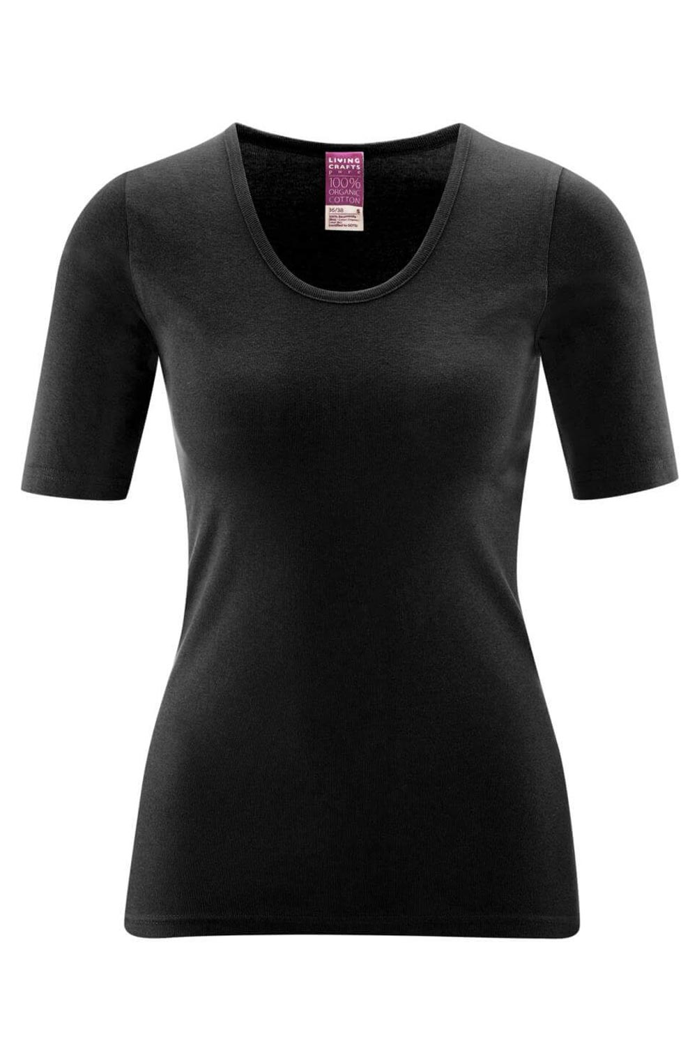 Lekker ondershirt met korte mouw voor de vrouwen die een hemd te koud vinden. Dit shirt met korte mouw is van 100% biokatoen en verkrijgbaar in drie kleuren, ongebleekt off-white, zwart en een soort paars-roze. Het aangesloten shirt is door de stevige stof ook goed als bovenkleding te dragen, want de stof tekent niet.
