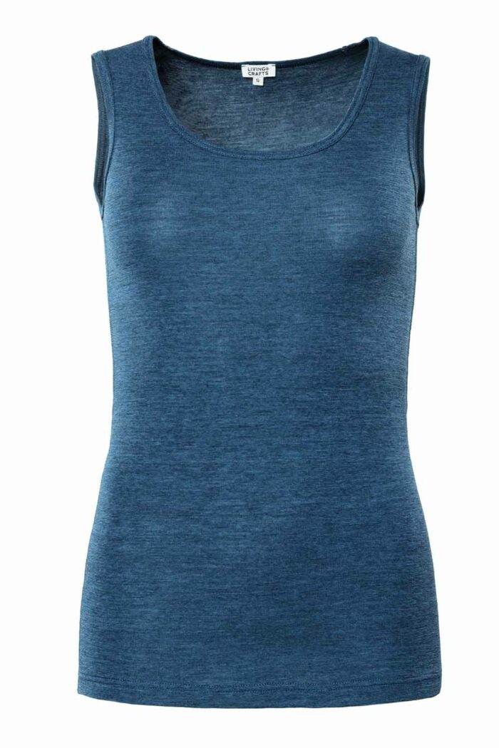 Een fijn en zacht bio wol met katoenen top. Heerlijk voor de koudere dagen, maar omdat wol temperatuur-regulerend werkt, draag je dit hemdje ook prima op warme dagen, bijvoorbeeld onder een luchtige blouse.