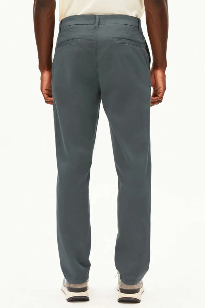 Staal grijskleurige Chino, dus een broek met steekzakken. De pijpen lopen taps toe. Materiaal: 97% biokatoen, 3% elastan. Dit model is de opvolger van de Aathan