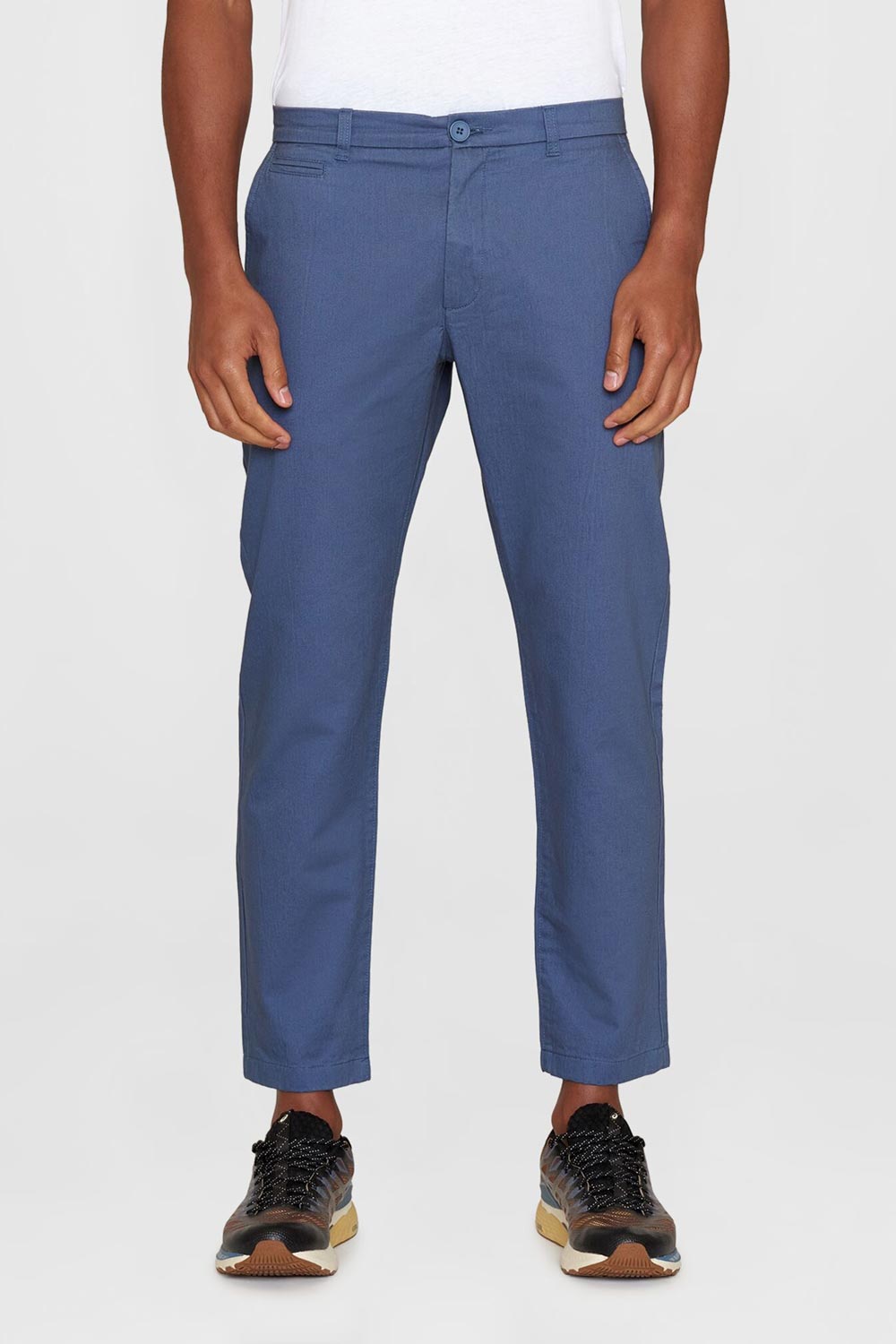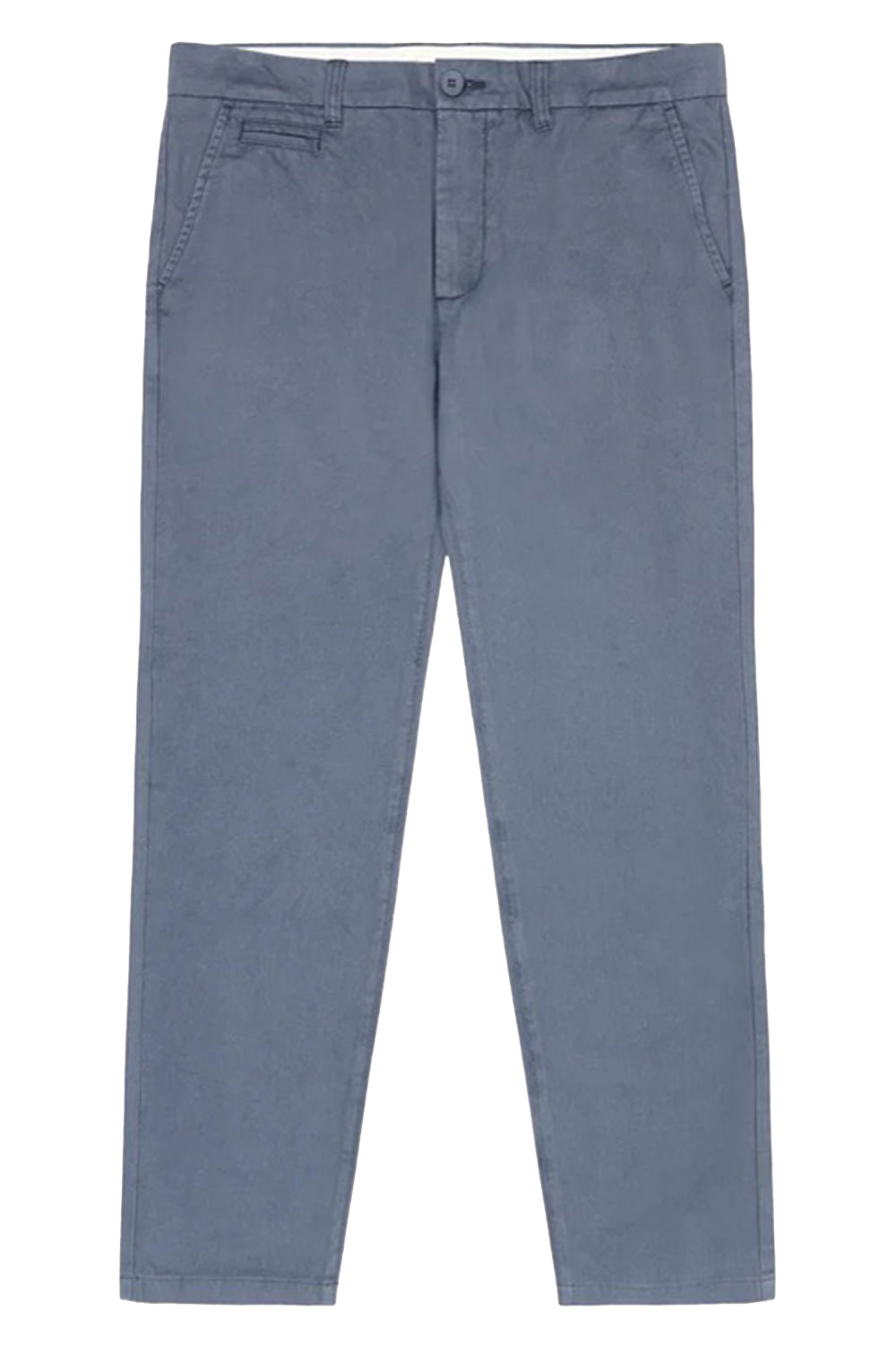 Mooie basic pantalon die in elke garderobe en in elk seizoen past: Chino-broek van 100% biologische katoen. De denimblauwe chino heeft steekzakken en twee zakken achterop.