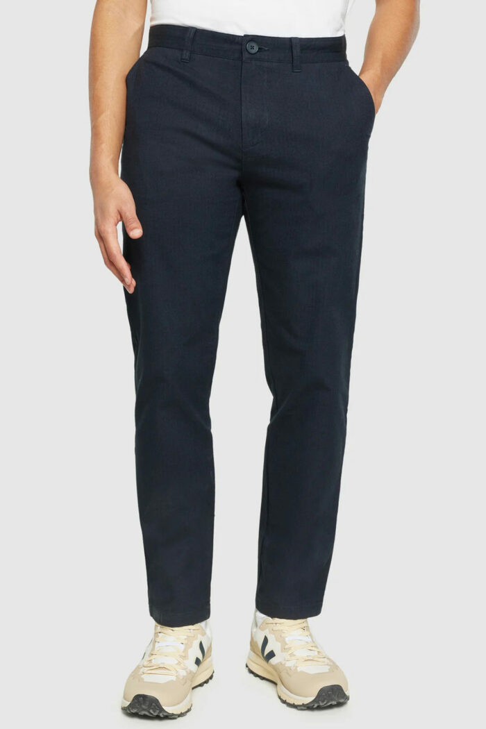 Midrise chino in donkergrijs met visgraatmotief van 97% biokatoen en 3% elastaan. Nette broek die met veel kleuren te combineren is.