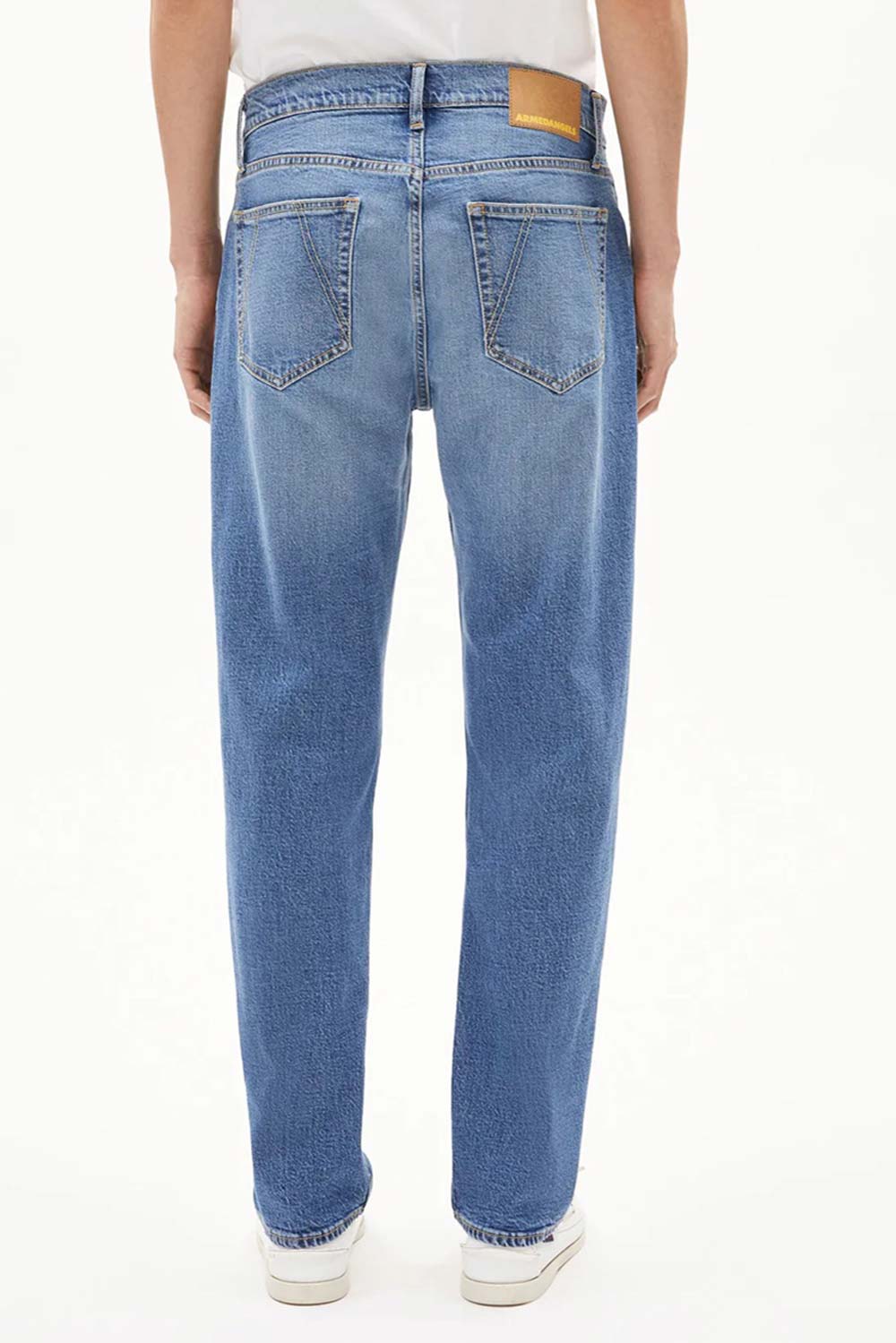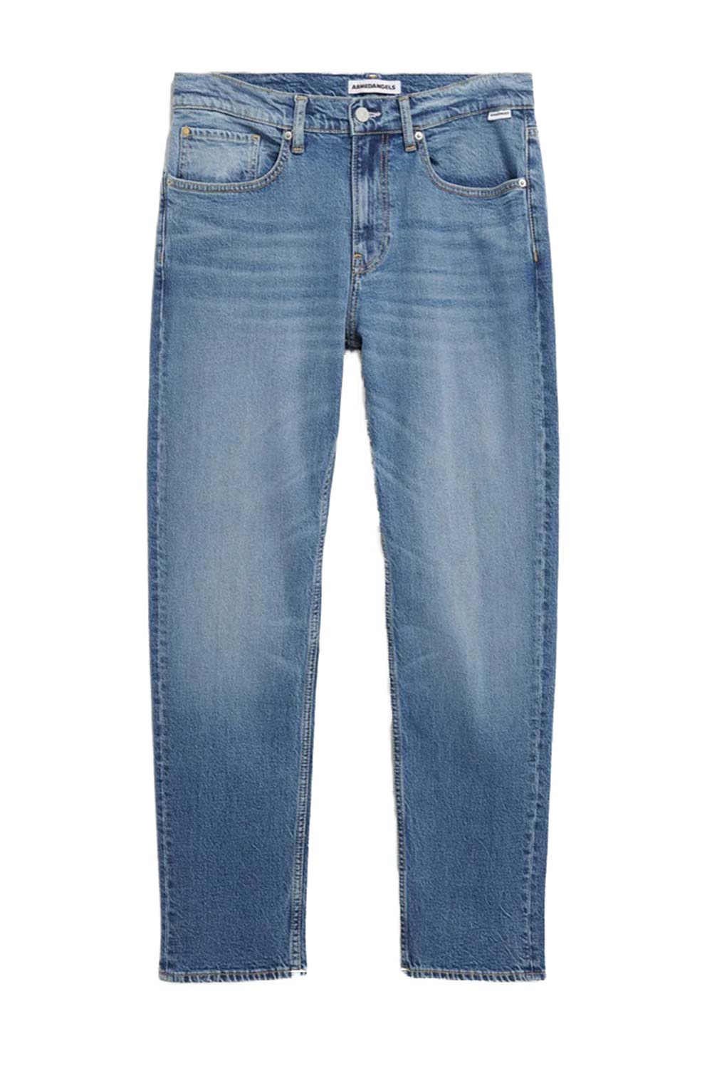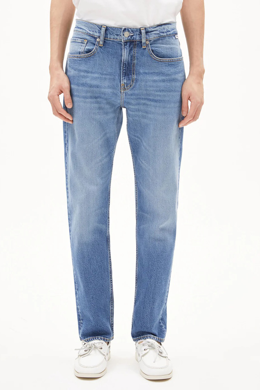 5-Pocket blauwe spijkerbroek van 79 % biokatoen, 20% gerecycled katoen en 1% elastaan. De jeans heeft rechte pijpen en een gulp met een rits.